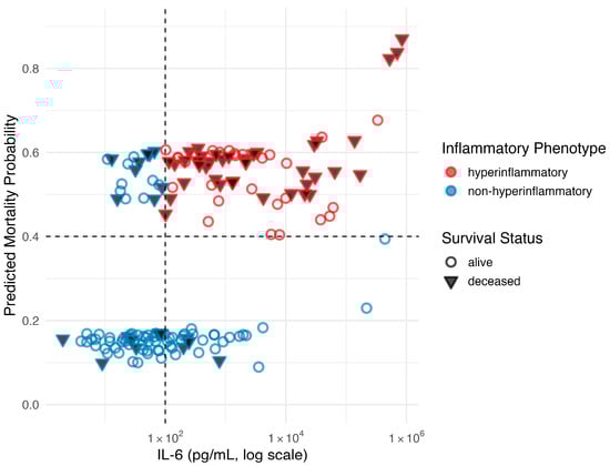 IL-6 concentrations (log scale) plotted against predicted mortality probability, colored by inflammatory phenotype, and with shapes indicating survival status. The hyperinflammatory phenotype was defined as IL-6 ≥ 100 pg/mL combined with a predicted mortality probability > 40% based on Bayesian logistic regression.