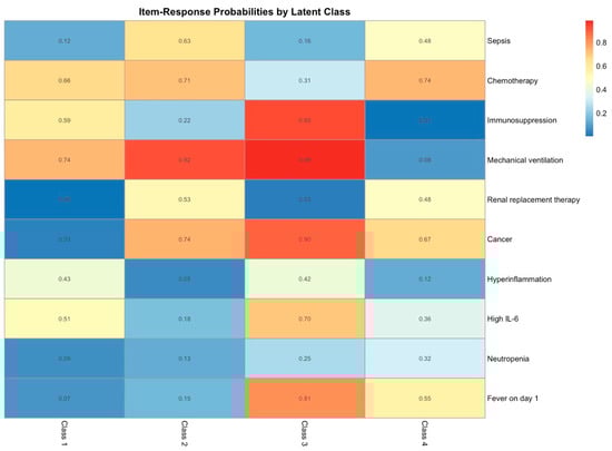 Heatmap of item–response probabilities for each latent class. Values range from 0 to 1, with higher values (yellow to red) indicating a greater probability that a patient in the given class exhibits the item, and lower values (blue) indicating a lower probability. Items include sepsis, chemotherapy, immunosuppression, mechanical ventilation, renal replacement therapy, cancer, hyperinflammation, high IL-6, neutropenia, and fever on day 1.