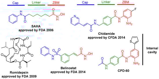 All these inhibitors share a common pharmacophore composed of a zinc-metal binding motif (ZBM), a linker region (linker), and a surface recognition domain (Cap). In the case of benzamide derivatives, CPD-60 is a class 1 and 2 selective inhibitors with an inhibitory range of 10–50 nM, which is more than five-fold selective for HDAC1 [,,], indicating that the substituents that are introduced into the internal cavity could have higher selectivity. Additionally, CPD-60 stands out for its attractive selectivity profile and has been used as a lead compound for developing new inhibitors targeting specific HDAC isoforms and complexes.