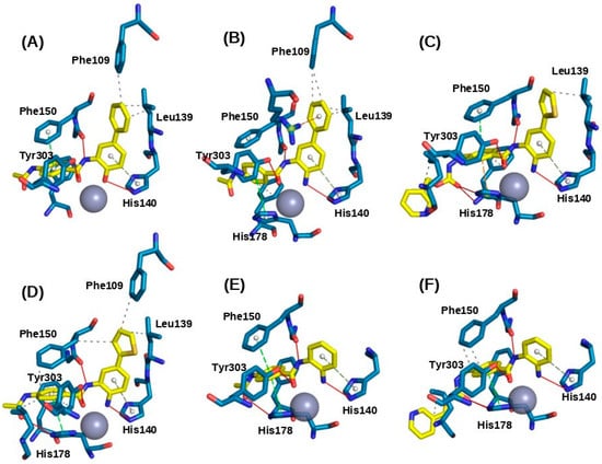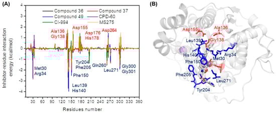 It is noteworthy that the contribution of the residues Met30 and Arg34 interacts with the aromatic ring substituent of the principal core; this interaction is consistent with the electrostatic contour map in generating stability through hydrogen bond interactions and with the negative steric contour map, which restricts the cavity from accommodating the ligand. Moreover, residues Phe150, Cys151, Phe205, and Leu271 interacted with the linker region of the inhibitor; these interactions were in accordance with the electrostatic map contours and indicated that they were stabilized by stacking between aromatic rings in this region of the receptor. However, unfavorable contributions of residues Ala136, Gly138, and Asp155 were observed. This was attributed to the residues being part of the internal cavity, generating movement restrictions in the ligands. On the other hand, the residues bound to Zn2+ (Asp176, His178, and Asp264) also show an unfavorable interaction energy, possibly because zinc shows different energetic tendencies for the dissociation of Zn2+ in the presence and absence of solvent molecules, depending on the protein environment []. These interactions are depicted in Figure 6B, where the blue color represents interactions favorable to energy and the red color represents unfavorable interactions.