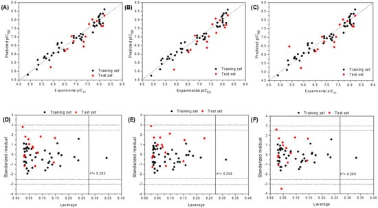 Once a valid and robust model was established, determination of the applicability domain (AD) became imperative to meet another requirement set forth by the OECD []. The AD is defined as the response and chemical structure space within which the model generates predictions with a specified level of reliability. Ensuring the appropriate application of any model for predicting new, untested compounds is therefore critical. Among the numerous methods available to define the AD [], this study employed the leverage method [,,] (a distance-based approach). The corresponding Williams plots (standardized residuals versus leverage) for the ligand and receptor models are presented in Figure 3D–F.
