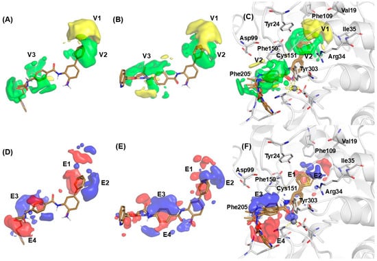 PLS pseudo-coefficients for the selected representative compounds. The vdW interaction: positive values in green and negative values in yellow; (A) LB1, (B) LB2, and (C) RB models. Electrostatic interactions: positive values in blue and negative; (D) LB1, (E) LB2, and (F) RB models.