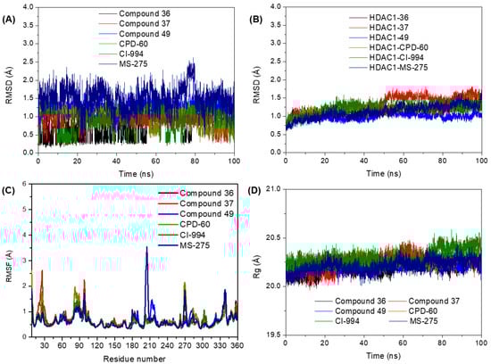 To generate a comprehensive understanding of the interactions between benzamide compounds and HDAC1 receptors, molecular dynamics (MDs) simulations were conducted on the six most active compounds (36, 37, 49, CPD-60, CI-994, and MS275) in their docked complexes. It is noteworthy that the MDs simulations were performed considering the structural K+ in both sites, as reported by Sixto-López et al. [,]. The equilibrium and stability of the MD simulations were evaluated through root mean square deviation (RMSD) of the backbone atoms in HDAC1 relative to the initial structure, computed based on MD trajectories. Figure S1 (Supplementary Data) illustrates RMSD of the backbone atoms for all ligand-receptor complexes computed based on MD trajectories. Figure 5 presents the RMSD for the ligand (Figure 5A) and receptor (Figure 5B) during the 100 ns simulations. The results indicate that the RMSD values for the six inhibitors remain below 1.5 Å, suggesting that all inhibitors demonstrate stability within the binding pocket of HDAC1.