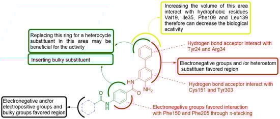 Therefore, energy decomposition analysis, in conjunction with contour map analysis, provides an important tool for developing a structural-activity model. Figure 7 summarizes the main requirements for new benzamide derivatives for high inhibition of HDAC1.