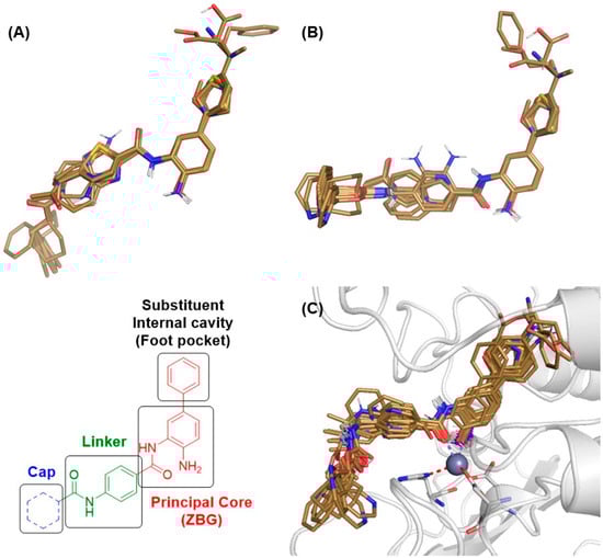 This section elucidates the docking results of benzamide inhibitors within the active site of the HDAC1 enzyme, focusing on the most characteristic ligand-receptor interactions for selected key inhibitor structures. In all instances, the benzamide scaffold ring binds within the hydrophobic cavity of the active site rather than extending outside the pocket, consistent with previously reported behavior for other benzamide compounds [,]. In this context, a comprehensive analysis was conducted on a set of molecules based on the distinct interactions of their molecular fragments, including the ZBM, linker region, and surface-recognition domain. However, the majority of the compounds in this set lacked a bulky substituent in the cap region; therefore, emphasis was placed on the linker region and the internal cavity. Figure 2 illustrates the molecular docking modes of the selected compounds within the HDAC1 binding site.