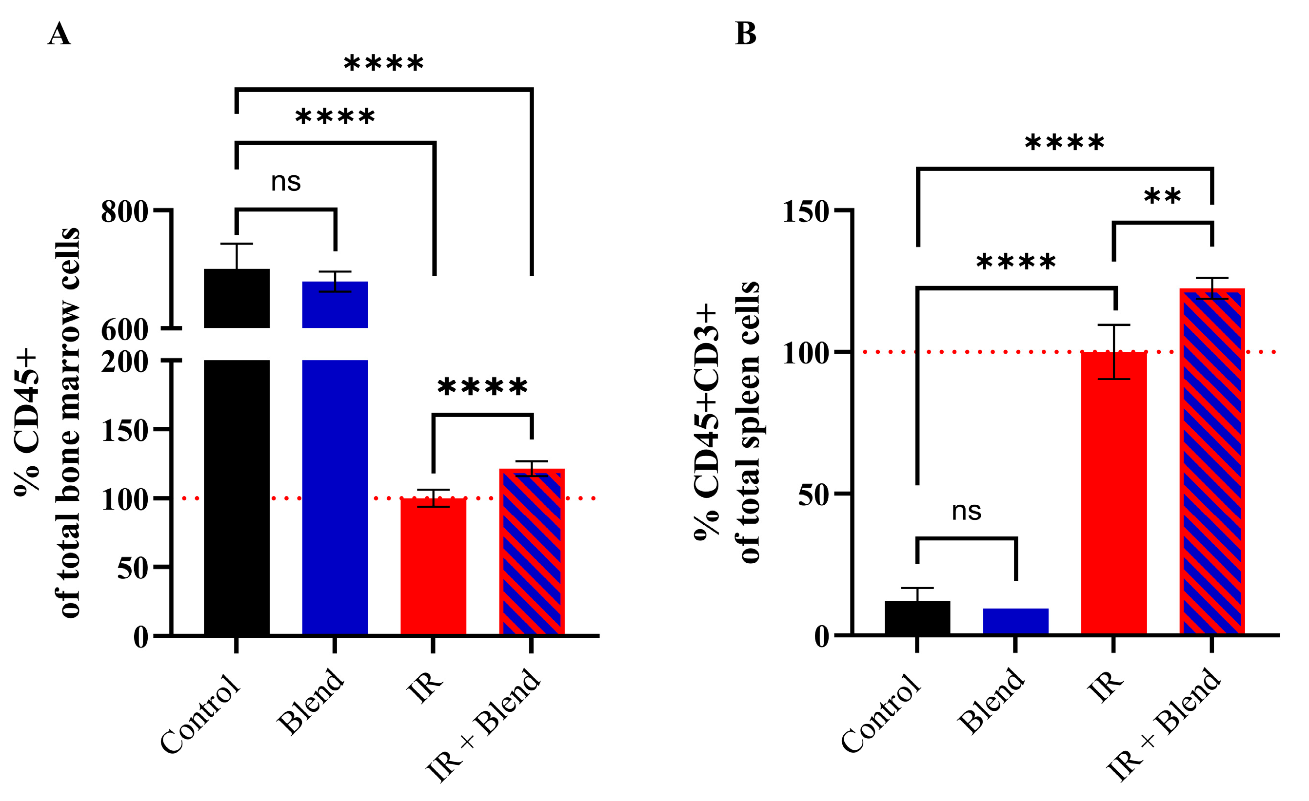 Figure 3. Flow cytometry-based detection of (A) CD45+ in bone marrow cells and (B) CD45+CD3+ in the spleen cells. The results are shown as a percentage of the values obtained in the IR control group (set as 100%) and presented as means ± SD (n = 6). Statistical analysis was conducted using Student’s t-test. Significance levels: **** p < 0.0001; ** p < 0.01; ns—not significant.