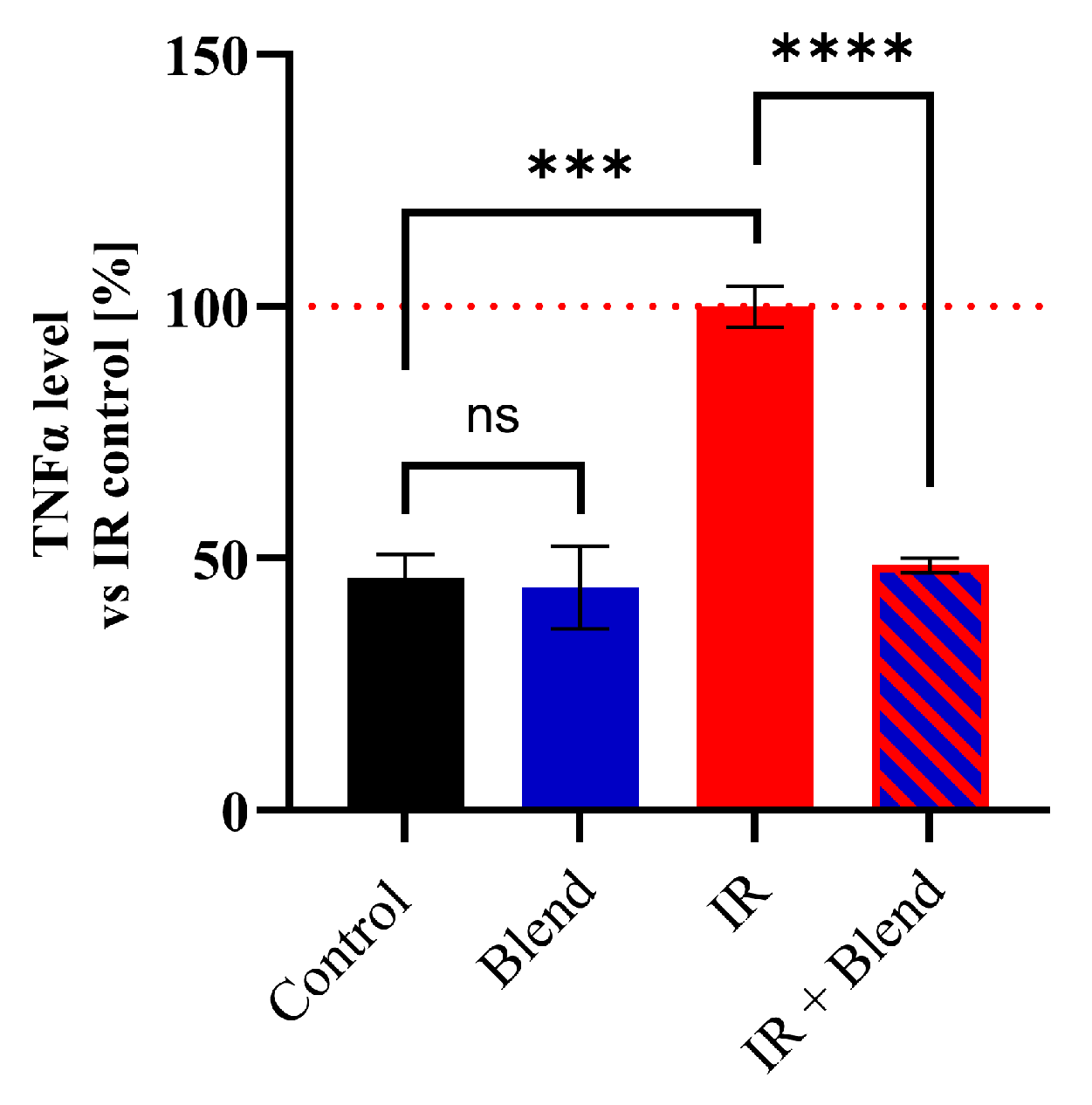 To determine how IR and supplementation with the extract blend could affect the ability of BM cells to produce TNF-α following stimulation with PMA and ionomycin, TNF-α levels were measured in the supernatants of BM cells using ELISA (Figure 4). TNF-α levels significantly increased by 53.93% (p < 0.001) in the IR group compared to the negative control group. In contrast, in the group irradiated after supplementation with the extract blend, no increase in TNF-α level was observed.
