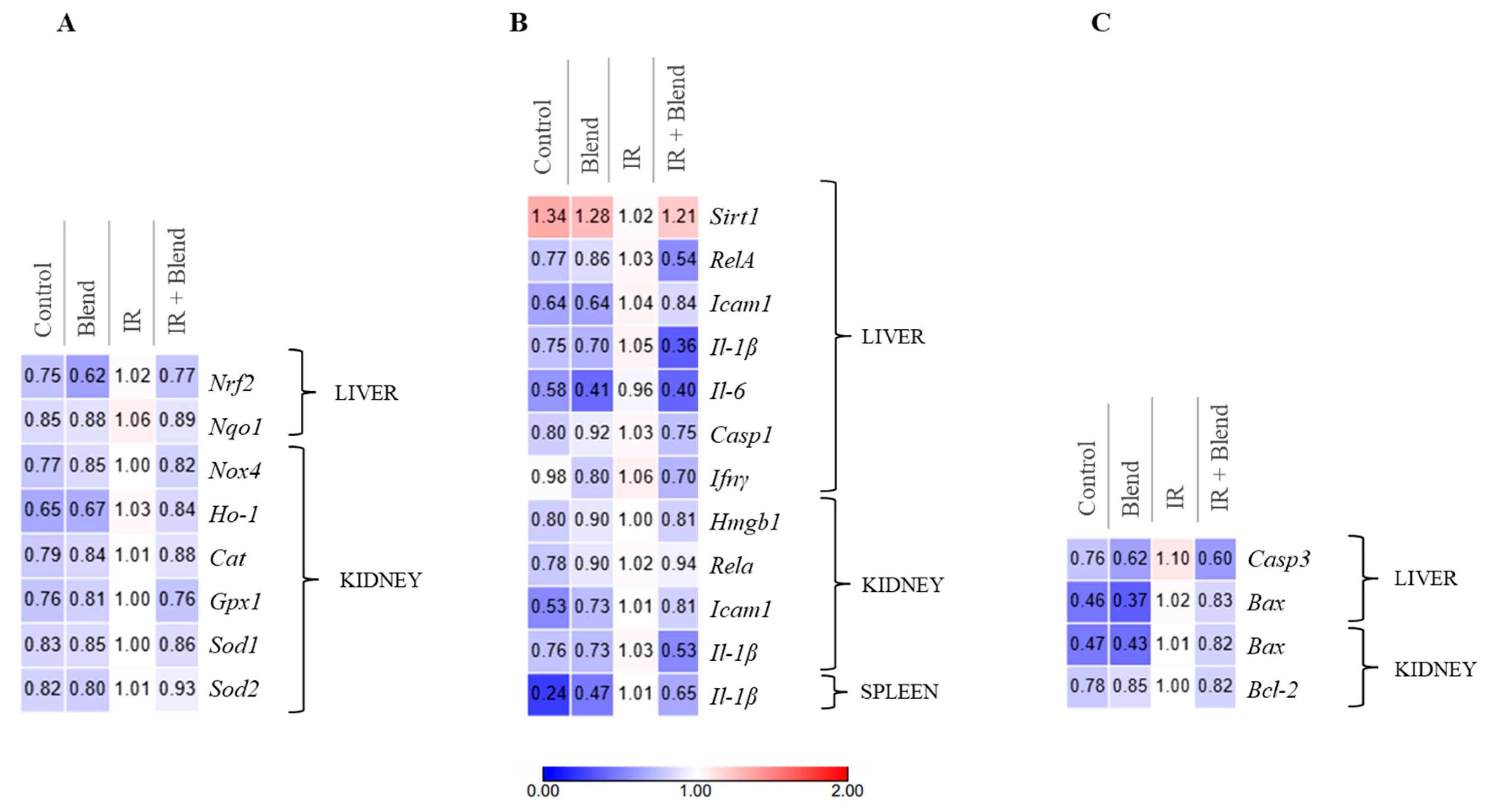 Gene expression related to oxidative stress, inflammation, and cell death was analyzed in the liver, kidneys, and spleen isolated from mice. In the group exposed to IR, an upregulation of genes expression associated with oxidative stress was observed in the liver and kidneys (Figure 5A). In the liver, radiation triggered the activation of Nrf2 (Nuclear factor erythroid 2-related factor 2) and the induction of the ROS-neutralizing enzyme Nqo1 (NAD(P)H-quinone dehydrogenase 1). In the kidneys, oxidative stress induction was indicated by increased expression of the Nox4 gene (NADPH oxidase 4) and a decreased expression of genes encoding the antioxidant enzymes, including Ho-1 (Heme oxygenase), Cat (Catalase), Gpx1 (Glutathione peroxidase 1), Sod1 (superoxide dismutase 1), and Sod2 (superoxide dismutase 2). In contrast, supplementation with the blend prevented these IR-induced alterations, maintaining the expression of oxidative stress-related genes at levels comparable to the non-irradiated control group, indicating a protective effect.
