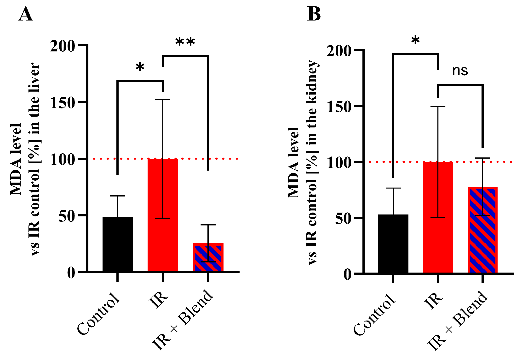 Figure 6. MDA concentration levels in mouse (A) liver and (B) kidneys. The results are presented as means ± SD (n = 9). The results are shown as a percentage of the values obtained in the IR control group (set as 100%) and presented as means ± SD (n = 9). Statistical analysis was conducted using Student’s t-test. Significance levels: ** p < 0.01; * p < 0.05; ns—not significant.