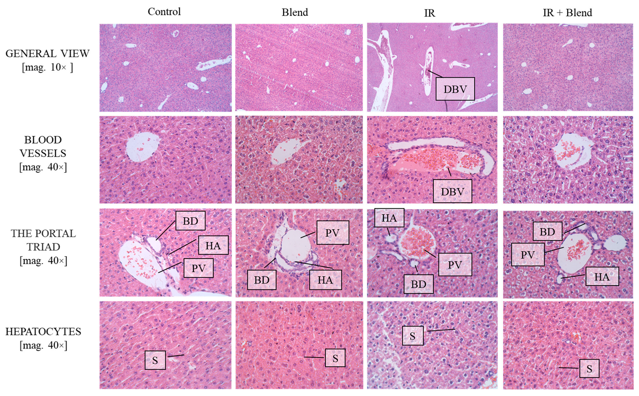 Figure 7. Microscopic sections of mouse liver tissues stained using the H&E method. Cell nuclei are visible as blue-purple areas, while the cytoplasm and extracellular structures appear pink–red. DBV—Dilated Blood Vessels; BD—Bile Ducts; HA—Hepatic Artery; PV—Portal Vein; S—Sinusoids. For each mouse, at least 10 images were taken from different microscopic fields at two magnifications fold (10× and 40×).