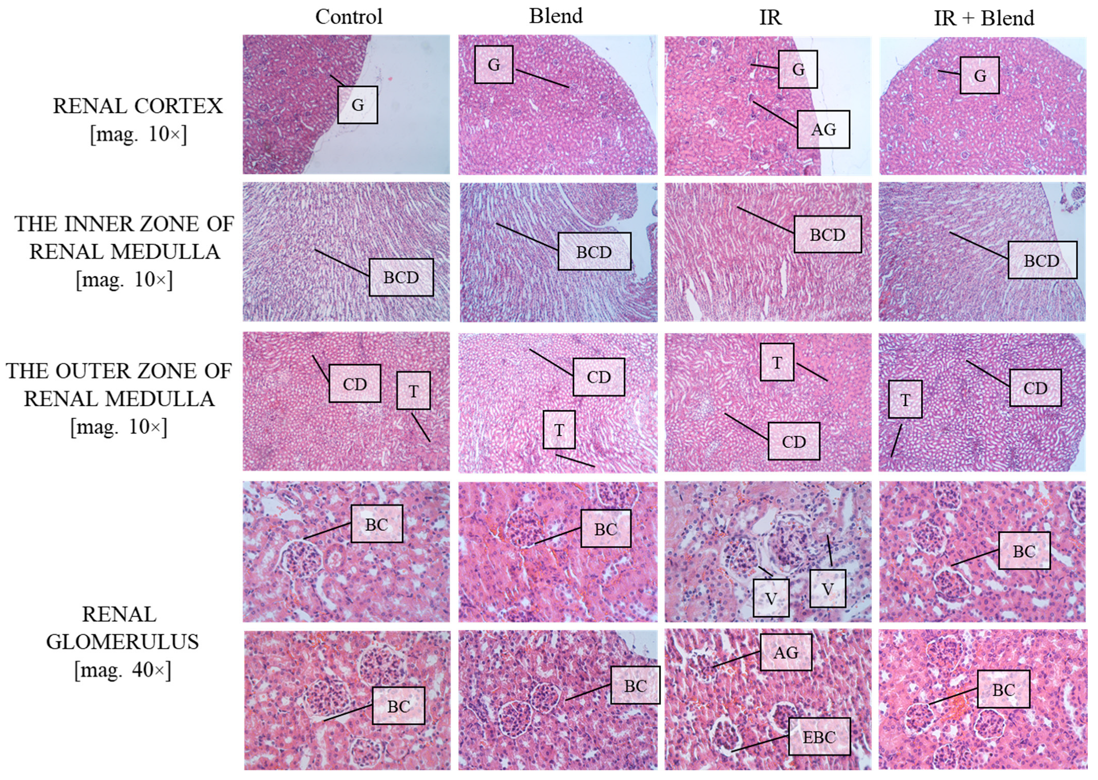 Histological evaluation of kidney sections revealed marked differences in tissue morphology across the experimental groups. In the control group, normal renal histology was observed, with well-preserved Bowman’s capsules (BC) and intact glomerular and tubular structures, showing no evidence of cellular stress, inflammation, or structural alterations. The IR group exhibited significant structural alterations, including expansion of Bowman’s capsules (EBC), vascular congestion (V), and apparent tubular degeneration, with widespread tubular vacuolization and irregular glomerular arrangement. Additionally, observed apoptotic glomerular cells (AG) and interstitial abnormalities indicated radiation-induced renal injury. In the irradiated group supplemented with the extract blend, renal tissue demonstrated notable attenuation of these damages. Although mild swelling and early degenerative changes were still present, the overall morphology of the kidney tissue, including Bowman’s capsules and glomerular structure, was comparatively well preserved relative to the IR group with fewer apoptotic cells and less vascular congestion (Figure 8). These observations support a protective effect of the blend against radiation-induced kidney injury, partially maintaining normal tissue architecture, as well as reducing cellular and vascular alterations.