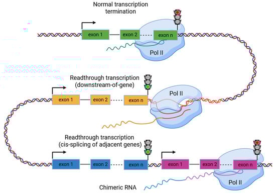 In the human genome, the number of protein-coding genes is markedly lower than the number of transcripts, owing to mechanisms, such as RNA editing, alternative splicing, alternative transcriptional start and termination, and other post-transcriptional modifications. One critical step in this regulation is transcription termination by RNA polymerase II, a tightly controlled process involving the cleavage of nascent RNA and the release of the polymerase to ensure precise production of mature mRNAs. As RNA polymerase II reaches the 3′-end of a gene, it transitions into a termination phase orchestrated by RNA cleavage, polyadenylation, and the subsequent disassembly of the transcriptional complex (Figure 1). Under certain conditions, the transcription machinery may fail to recognize the termination site and continue transcription beyond the annotated gene boundaries, a phenomenon known as readthrough transcription, or downstream-of-gene (DoG) transcription (Figure 1).