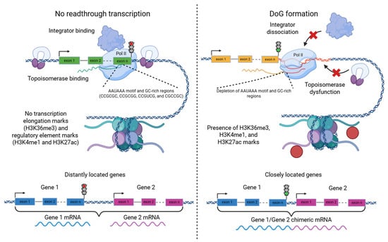 (C) Chromatin accessibility. Genes that generate readthrough transcripts show increased enrichment of transcription elongation marks (H3K36me3) and regulatory element marks (H3K4me1 and H3K27ac) at the 3′-end region of the gene and downstream of the polyadenylation site. These genes also frequently exhibit DNase I hypersensitivity sites downstream of the polyadenylation site. This is observed not only under stress conditions but also in normal states, suggesting that an open chromatin conformation facilitates DoG formation [,]. However, mutations or suppression of the histone methyltransferase SETD2, which is responsible for H3 lysine 36 methylation, lead to increased DoG production despite the presence of H3K36me3 []. This indicates that not merely the presence, but also the distribution pattern of H3K36me3 is important. Based on histone mark distribution, it has also been suggested that active enhancers may serve as barriers to readthrough transcription [].