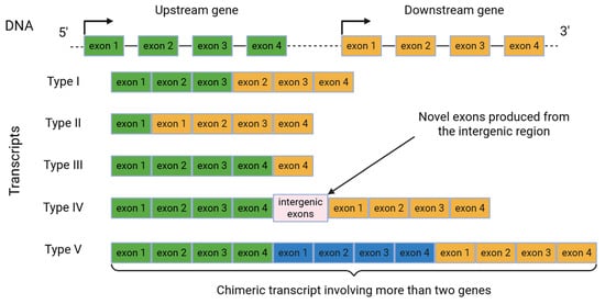 Several classifications of cis-SAGe have been proposed depending on the exon composition of the participating genes [,]. For instance, the study [] describes five major types (Figure 3). Type I, the most frequently observed, occurs when transcription bypasses the termination site located at the 3′-UTR of the upstream gene, extending into the downstream gene while excluding the last exon of the upstream gene and the first exon of the downstream gene. Type II links the first exon of the upstream gene, which may have regulatory motifs for proper transcription regulation, with exons of the downstream gene. Type III involves exons of the upstream gene and the last exon of the downstream gene and contributes to transcription termination efficiency. Type IV incorporates novel exons from the intergenic region, whereas Type V involves more than two genes in chimeric transcript formation.