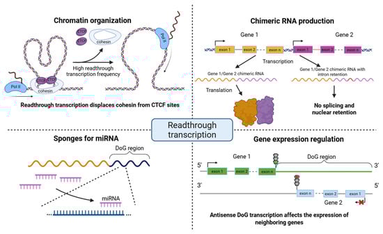 DoGs are increasingly recognized as a hallmark of transcription termination defects [,,,]. Their biological roles are diverse, affecting multiple cellular processes, including the production of RNA chimeras, chromatin organization, miRNA regulation, and the expression of neighboring genes [,,,] (Figure 4). In particular, there are several studies providing evidence that readthrough transcription can exert profound effects on gene expression [,]: readthrough transcripts can extend into the neighboring genes, thereby repressing their activity through transcriptional interference, or give rise to RNA chimeras. Chimeric transcripts spanning multiple genes with retained introns have been observed when splicing fails due to disruption of NAB2, a factor essential for proper 3′-end cleavage [,]. Beyond transcriptional interference, readthrough transcription has also been implicated in shaping host genome 3D organization []. In that study, the viral non-structural protein NS1 promotes readthrough transcription of highly active genes, leading to cohesin displacement from chromatin, loss of chromatin loops, and decompaction of chromatin within the readthrough regions. Further studies will be necessary to disentangle the relative contributions of NS1-mediated disruption of mRNA processing, widespread readthrough transcription, and altered chromatin structure in the suppression of host antiviral responses and the enhancement of viral virulence. In addition, DoGs have been detected within the chromatin-bound RNA fraction, where they appear to colocalize with their upstream DoG-producing transcripts []. Given their considerable length, this observation suggests a potential role for DoGs in reinforcing the nuclear scaffold. Further investigation will be required to determine whether DoGs influence gene expression directly, in addition to contributing to nuclear integrity and stabilizing genomic regions that promote their own formation. Therefore, it is important to analyze the hallmarks of readthrough transcription that give rise to DoGs and cis-SAGes in healthy and cancer tissues.