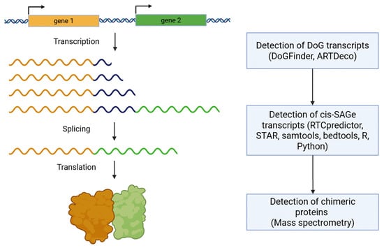 Another important case of readthrough transcription is the formation of chimeric mRNAs through cis-splicing of a shared transcript from two co-oriented genes, known as cis-SAGe. Between 10 and 20% of all genes in healthy tissues produce such transcripts, predominantly protein-coding genes []. Chimeric cis-SAGe transcripts can constitute up to 34% of active protein-coding genes under normal conditions [] and up to 55% under stress []. Most chimeric transcripts are formed through splicing at the canonical sites of both participating genes []. Typically, the junction connects the penultimate exon of the upstream (5′) gene with the second exon of the downstream (3′) gene [,]. Similarly to DoGs, cis-SAGe chimeric transcripts show expression patterns that correlate with the 5′-gene [], but not with the 3′-gene.