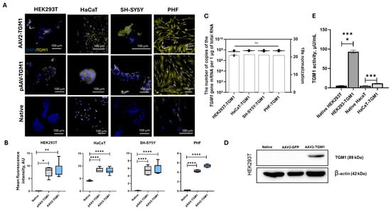 Functional analysis of recombinant AAV2-TGM1. (A) Immunofluorescence analysis of TGM1 protein expression in HEK293, SH-SY5Y, HaCaT, and PHF cells 96 h after AAV2-TGM1 transduction. (B) Analysis of the mean fluorescence intensity in modified cells. (C) Analysis of TGM1 mRNA levels in AAV2-TGM1 transduced cells (96 h after transduction). Data were obtained by RT-PCR and are presented as the mean of 3 biological replicates ± SD. Target gene expression levels were normalized to 18S rRNA. The gray box indicates the expression level of 18S represented in amplification cycles. (D) Western blot analysis of TGM1 (89 kDa) and β-actin (42 kDa) protein expression in lysates from in native and transduced HEK293 cells. (E) TGM1 enzymatic activity in native and AAV2-TGM1 transduced HEK293 and HaCaT cells. *—p < 0.05, **—p < 0.01, ***—p < 0.001, ****—p < 0.0001, ns > 0.05.