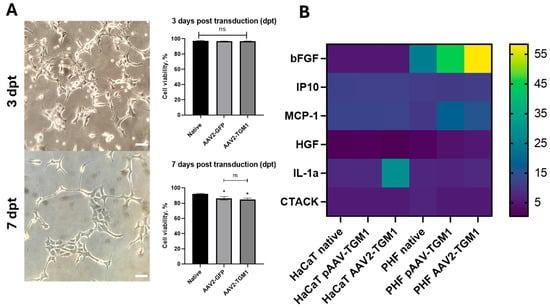 (A) Viability assessment of HEK293 cells transduced with AAV2-TGM1 and AAV2-GFP at 3 and 7 days post-transduction. Data were obtained by flow cytometry and are presented as the mean of 3 biological replicates ± SD. dpt—days after transduction. Scale bar: 20 µm. (B) Cytokine profile analysis of the conditioned medium of HaCaT and PHF cells after pAAV-TGM1 transfection and AAV2-TGM1 transduction. *—p < 0.05, ns > 0.05.