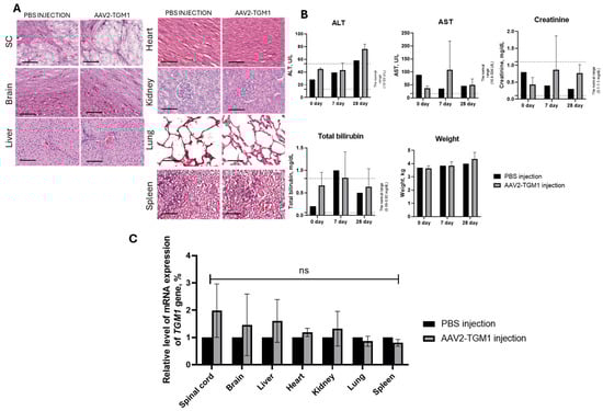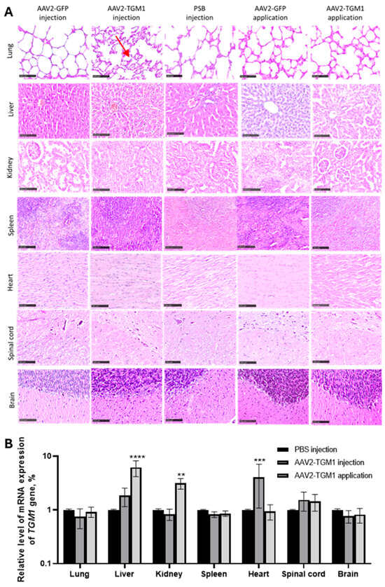Evaluation of the parenchymatous organs and the central nervous system (CNS) revealed no pronounced inflammatory infiltrates, necrosis, or dystrophic changes in the experimental and control groups (Figure 7A). However, isolated instances of thickening of the interstitium and interalveolar septa in the lungs were observed in the AAV2-TGM1 injected group (red arrow), as well as localized death of spinal cord neurons in both control and experimental groups. Single samples of liver tissue in the control and experimental groups showed focal fine fatty dystrophy (representative images of these incidental findings are not shown due to their low incidence). Importantly, biodistribution analysis of the AAV2-TGM1 vector demonstrated a 6-fold increase in transgene mRNA levels in the liver and a 3-fold increase in the kidney following topical application, as well as a 4-fold increase in the heart after intradermal injection on day 7. These findings indicate that both applicative and intradermal delivery can result in systemic distribution of the viral vector through the bloodstream. None of the examined organs showed signs of acute toxicity, hemorrhage, or significant tissue degeneration.