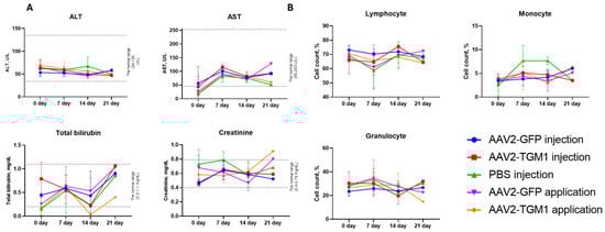 Statistical analysis with a significance threshold of p < 0.05 showed that none of the experimental groups (AAV2-GFP injection, AAV2-TGM1 injection, AAV2-GFP application, and AAV2-TGM1 application) exhibited significant changes in the proportions of lymphocytes, monocytes, and granulocytes compared to baseline (day 0) or to the PBS-injected control group at any time point (days 7, 14, and 21) (Figure 8B).