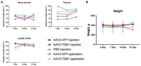 The viability of cells in rat lymph nodes remained high in all groups throughout the observation period, with slight fluctuations; in the control group with PBS injection, the indices varied from 92.4% to 95.7%. In the experimental groups, stable values were also observed, except for a slight decrease in the topical application AAV2-TGM1 group on the 21st day (88.3%). In the thymus, cell viability was decreased relative to the control group, with the most pronounced differences observed in the AAV2-TGM1 and AAV2-GFP injection groups, where viability decreased to 67.7% and 75.2%, respectively. In contrast, higher viability (80% to 91.6%) was maintained in the control group and the topical application AAV2-GFP and AAV2-TGM1 groups. In the bone marrow, cell viability in all groups was slightly lower than in the lymph nodes and thymus ranging from 66.1% to 81.4%. The most pronounced decrease was observed in the AAV2-TGM1 injection group on day 21. Overall, topical application of AAV2-GFP and AAV2-TGM1 was associated with fewer alterations in cell viability compared to intradermal injection (Figure 9A).