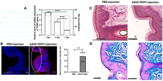 In the control group with PBS injection and in the groups with AAV2-GFP and AAV2-TGM1 injection, the body weight of rats remained stable or increased during the experiment, indicating that there was no pronounced adverse effect on the animals’ general condition. In the topical application groups (AAV2-GFP and AAV2-TGM1), a tendency toward decreased body weight was observed by day 21, suggesting a potential adverse effect of the scarification procedure used for the topical applications (Figure 9B).