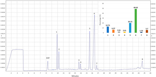 Electropherogram of the crude polysaccharides from M. procera Mp-CPS. EOF−electroosmotic flow; 1—mannitol; 2—trehalose; 3—unknown I; 4—fucose; 5—galactose; 6—glucose; 7—mannose; 8—unknown II and the bar chart of percentage distribution of monosaccharides in Mp-CPS. Migration times of standards: mannitol—8.8812; trehalose—9.1729; fucose—12.9198; galactose—14.4872; glucose—15.2462; mannose—15.7151.