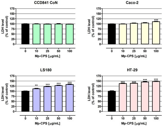 The results of the LDH assay (Figure 2) have shown cytotoxicity in all investigated cancer cell lines in response to Mp-CPS. The most sensitive for tested polysaccharides were HT-29 cells, wherein Mp-CPS even at the lowest tested concentration (10 µg/mL) increased the LDH release from damaged cancer cells by 37.6%, while similar results in LS180 cells were observed in response to Mp-CPS at a concentration of 100 µg/mL (increase by 33.1%). The most resistant to Mp-CPS were Caco-2 cells, wherein cell membrane damage was observed only after exposure to polysaccharides at the concentration of 100 µg/mL (increase by 10.8%). Studies conducted on human colon epithelial CCD841 CoN cells revealed no cytotoxic response to Mp-CPS, indicating the high selectivity of anticancer action of tested compounds. Moreover, the results of the LDH assay (Figure 2 and Table 4) revealed a positive correlation between the anticancer activity of Mp-CPS and colon cancer undifferentiation and invasiveness. The EC50 values (concentration causing cytotoxicity in 50% of cells compared to the control) calculated based on the results of the LDH assay were as follows: 2.673 × 1021 µg/mL (CCD841 CoN), 524 µg/mL (Caco-2), 371 µg/mL (LS180), and 174 µg/mL (HT-29). It is worth indicating that Mp-CPS had the worst efficiency in the elimination of Caco-2 cells, which are the least invasive but the most differentiated cell line among the tested ones. On the contrary, the most spectacular cytotoxic effect after Mp-CPS treatment was observed in HT-29 cells representing the advanced stage of colon cancer development [22,23].