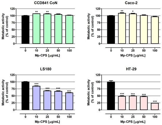 The results of the MTT assay (Figure 3) show that both CCD841 CoN and Caco-2 cells treated with Mp-CPS at the concentrations of 10 and 25 µg/mL increased metabolic activity (on average by 7.1% and 7.9%, respectively), while polysaccharides at concentrations of 50 and 100 µg/mL did not impact the proliferation of indicated cells. On the contrary, Mp-CPS revealed a strong antiproliferative effect against LS180 and HT-29 cells. Similar to previously described data, the most significant changes were observed in HT-29 cells, wherein Mp-CPS decreased cell proliferation by 51.7% (10 µg/mL) to 76.2% (100 µg/mL). Proliferation of LS180 cells treated with Mp-CPS was reduced from 15.1% (10 µg/mL) to 38.9% (100 µg/mL). Discovered antiproliferative properties of Mp-CPS against LS180 and HT-29 cells were reflected in the IC50 values (concentration causing proliferation inhibition by 50% compared to the control) presented in Table 4. The IC50 values determined for LS180 and HT-29 cells based on the results of MTT assays were as follows: 232 µg/mL and 15 µg/mL. It should be highlighted that the MTT assay also proved the great selectivity of the anticancer action of tested compounds understood as the lack of a negative influence on the proliferation of the normal colon epithelium (CCD841 CoN) and the model of the intestinal epithelium (Caco-2). At the same time, the significant inhibition of cancer cell proliferation (LS180 and HT-29) in response to Mp-CPS was observed and detected that the antiproliferative effect intensified with the increase in cancer malignancy [22,23].
