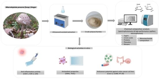 Despite extensive research on mushroom-derived polysaccharides, many edible species, including M. procera, remain underexplored as natural sources of bioactive compounds. Based on this rationale, the present study aimed to isolate and chemically characterize crude polysaccharides from M. procera fruiting bodies and to evaluate their biological activities, including antioxidant properties, inhibition of pro-inflammatory enzymes, and, especially, direct anticancer potential against human colon cancer cell lines. By addressing these objectives, the study contributes to the identification of new natural sources of bioactive polysaccharides and supports the ongoing search for compounds with chemopreventive and therapeutic applications.