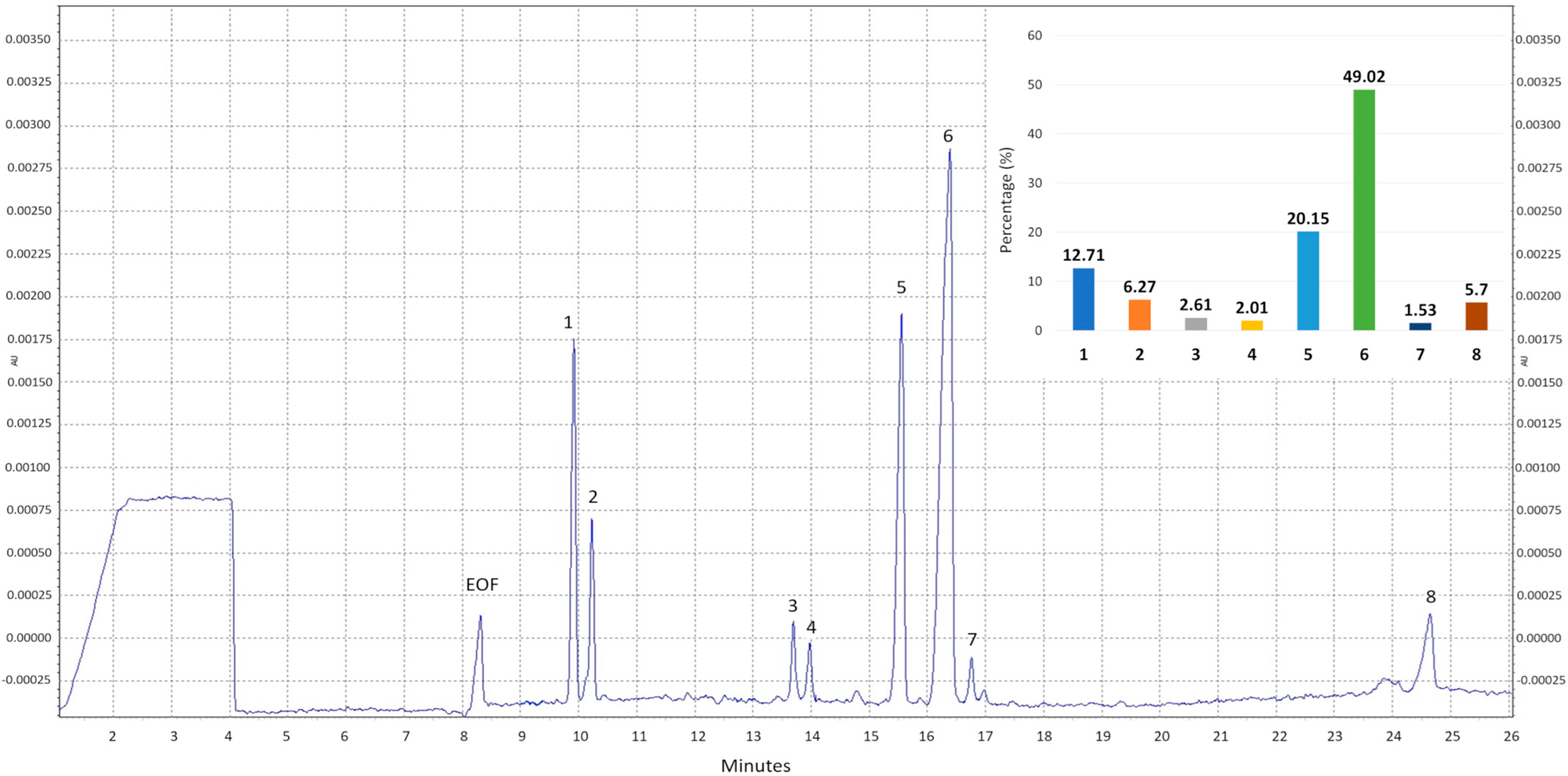 Figure 1. Electropherogram of the crude polysaccharides from M. procera Mp-CPS. EOF−electroosmotic flow; 1—mannitol; 2—trehalose; 3—unknown I; 4—fucose; 5—galactose; 6—glucose; 7—mannose; 8—unknown II and the bar chart of percentage distribution of monosaccharides in Mp-CPS. Migration times of standards: mannitol—8.8812; trehalose—9.1729; fucose—12.9198; galactose—14.4872; glucose—15.2462; mannose—15.7151.