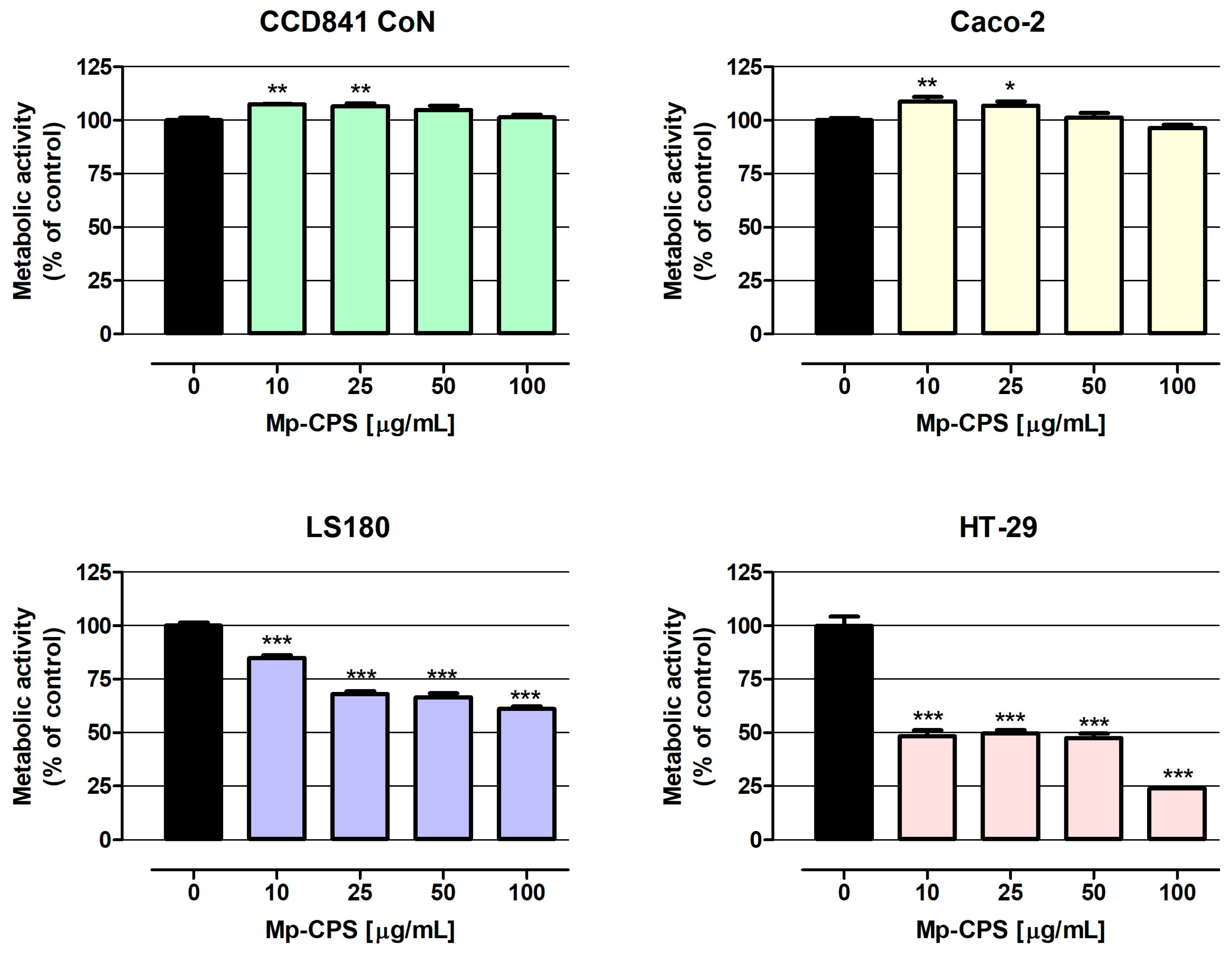 Figure 3. Antiproliferative effect of crude polysaccharides from M. procera on both normal and cancer colon cell lines. Human colon epithelial CCD841 CoN cells and human colon adenocarcinoma Caco-2, LS180, and HT-29 cells were treated with the crude polysaccharides Mp-CPS at concentrations of 10, 25, 50, and 100 μg/mL for 96 h. Mp-CPS’s impact on cell metabolic activity was measured photometrically by the MTT assay. Results are presented as mean ± SEM of at least 4 measurements. * p < 0.05 versus control, ** p < 0.01 versus control, *** p < 0.001 versus control, one-way ANOVA test; post-test: Dunnett.