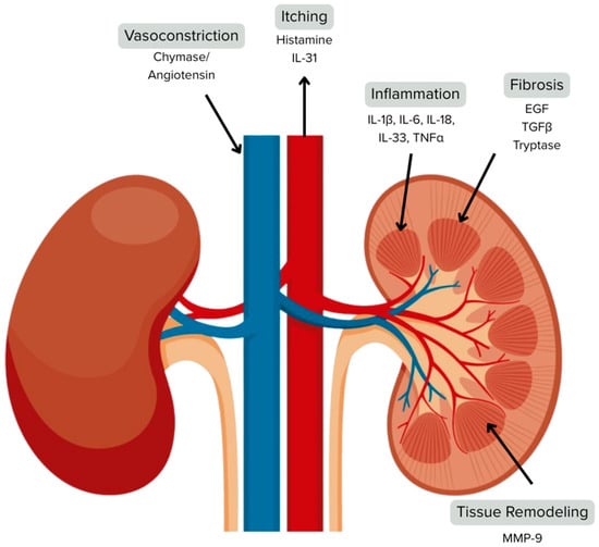 Beyond their infiltration into the kidney, MCs also reside in surrounding connective tissues, where they become activated. Upon stimulation, they release numerous biologically active mediators (Table 1), including prestored granulemolecules, such as histamine chymase, tryptase, and TNF-α, as well as newly synthesized prostaglandins, leukotrienes, chemokines, cytokines, and growth factors []. These mediators contribute to inflammation, immune regulation, tissue repair, and remodeling in kidney disease [,]. There is a strong correlation between atopic diseases that depend on MCs and idiopathic nephrotic syndrome [,].