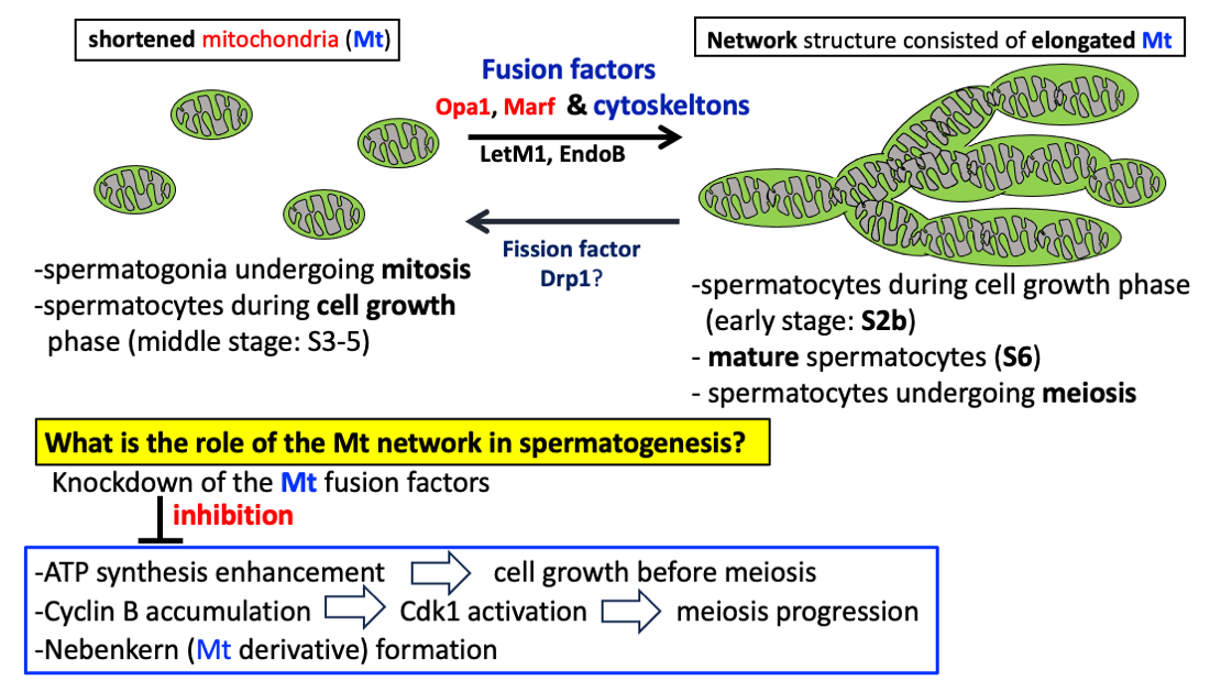 In this study, we focused on the morphological changes mitochondria undergo during Drosophila spermatogenesis, especially before and during meiosis. We investigated whether the mitochondrial fusion factors, Marf and Opa1, are required for the formation of a network structure consisting of the elongated mitochondria. We investigated whether the morphology proteins Letm1 and EndoB are also required for the mitochondrial morphological changes observed. Moreover, we investigated whether the mitochondrial network structure constructed via these gene products plays an indispensable role in male meiosis. We also addressed the mechanism underlying the fact that the knockdown of the fusion genes essential for the network structure inhibits meiosis. Since mitochondria are essential organelles in spermatogenesis, not only in Drosophila but also in mammals, our findings may provide important insights into the roles of mitochondrial dynamics in spermatogenesis.