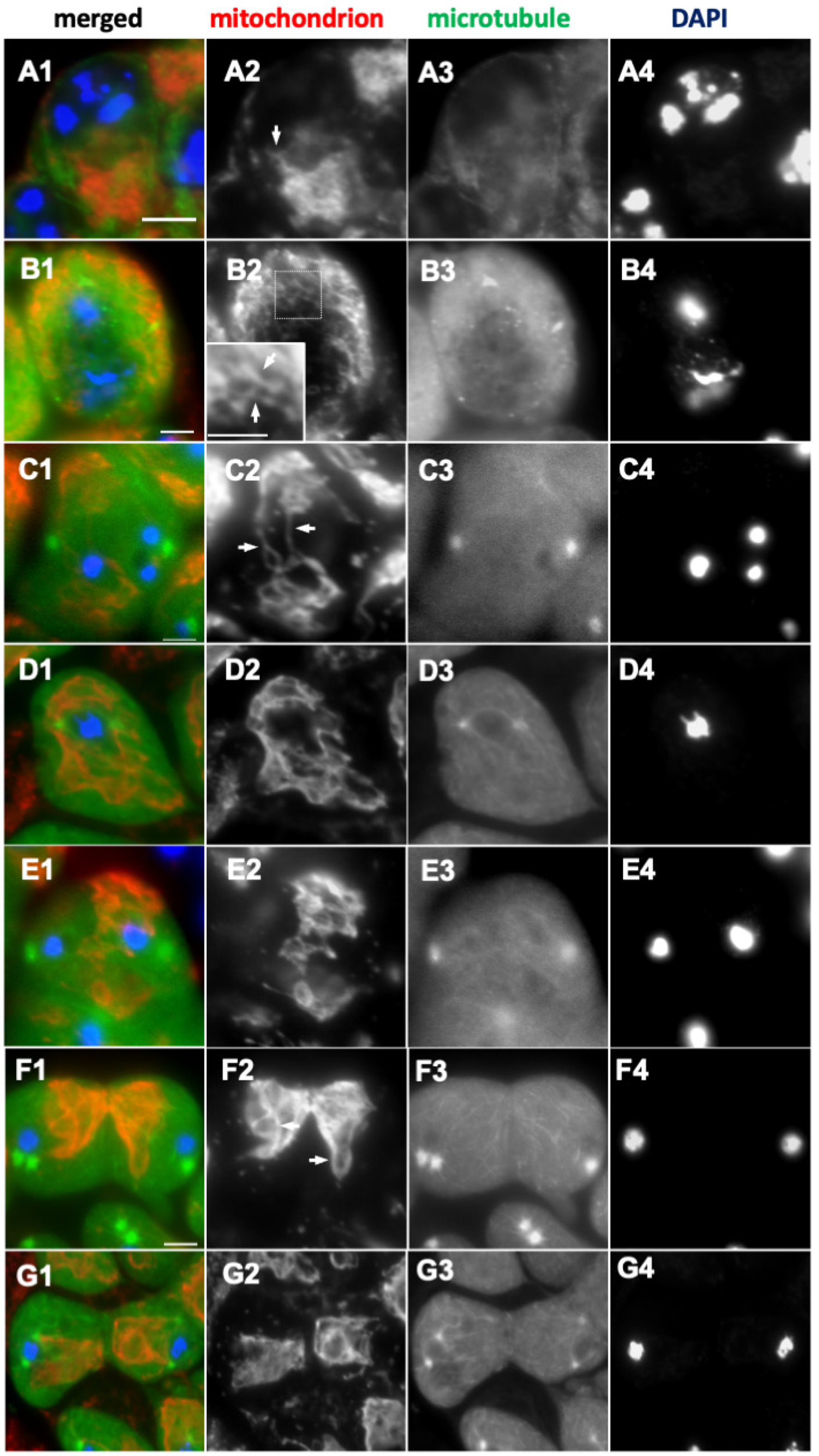 Figure 2. The distribution of mitochondria associated with microtubules in primary spermatocytes was disrupted by colchicine treatment. (A1G1) Immunostaining of colchicine-treated primary spermatocytes with anti-Complex V alpha-subunit antibody conducted to visualize mitochondria (red in (A1G1) and white in (A2G2)). The cells expressing GFP-Tubulin (green in (A1G1) and white in (A3G3)) were used to confirm microtubule depolymerization. DNA (blue in (A1G1) and white in (A4G4)). (A1) A colchicine-treated spermatocyte at S2b. Arrow: The elongated mitochondria. (B1) A colchicine-treated spermatocyte in the S6 stage. (inset: enlarged view of the area enclosed by a square). (C1G1) Mitochondria in colchicine-treated spermatocytes undergoing meiosis I in prophase-like (C1) and metaphase-like (D1) stages. Arrows in (C2): Mitochondria that remained localized in the cytoplasm while maintaining their network structure. (E1,F1) Cells that have passed through metaphase I/anaphase I before colchicine treatment. Arrows in (F2): Mitochondria whose orientations toward the microtubule-organizing center are lost. (G1) Telophase I cells. Bars: 10 μm.