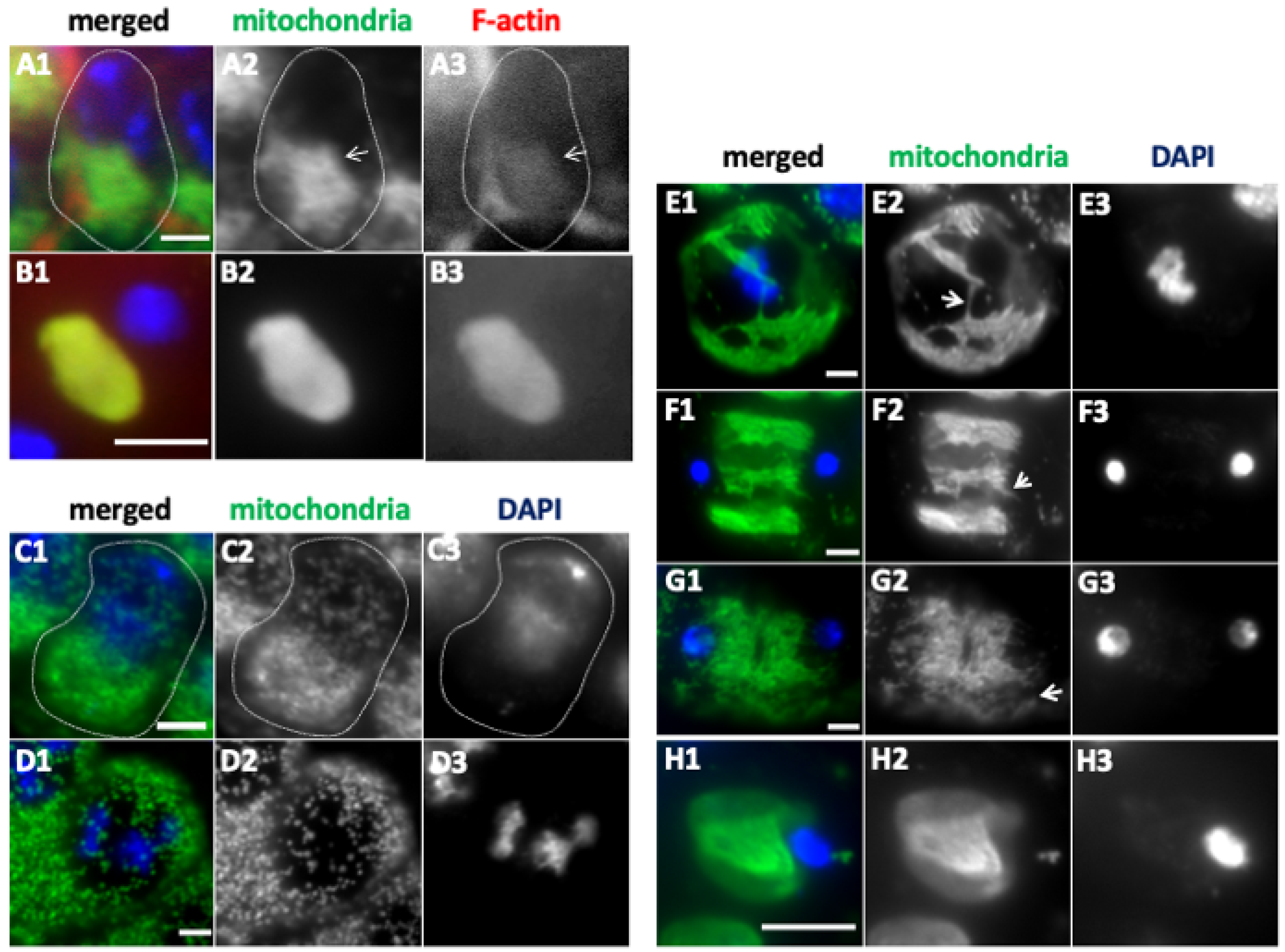 Figure 3. The close association between mitochondria and F-actin in spermatocytes in S2b of the growth phase and in early spermatids, and the perturbation of the distribution after Latrunculin A treatment. (A1,B1) Anti-Complex V alpha-subunit immunostaining conducted to observe the colocalization of mitochondria (green in (A1,B1) and white in (A2,B2)) with F-actin, visualized via phalloidin staining (red in (A1,B1) and white in (A3,B3)) of early spermatocytes at S2b (A1) and spermatids in the onion stage (B1). Arrow: elongated mitochondria in the S2b cell. A mitochondrial aggregate (Nebenkern) colocalizes with F-actin in the spermatid (B1). (C1H1) Mitochondria in the cells treated with Latrunculin A were visualized via immunostaining (green in (C1H1) and white in (C2H2)). DNA staining by DAPI (blue in (C1H1) and white in (C3H3)). (C1) Mitochondria in a spermatocyte in S2b. (D1) Shortened granular-like mitochondria in the spermatocyte in S6. (E1H1) Mitochondria in Latrunculin A-treated meiotic cells in metaphase I (E1), anaphase I (F1), and telophase I (G1), and a Nebenkern exhibiting heterogeneous staining in spermatids (H1). Bars: 10 µm.
