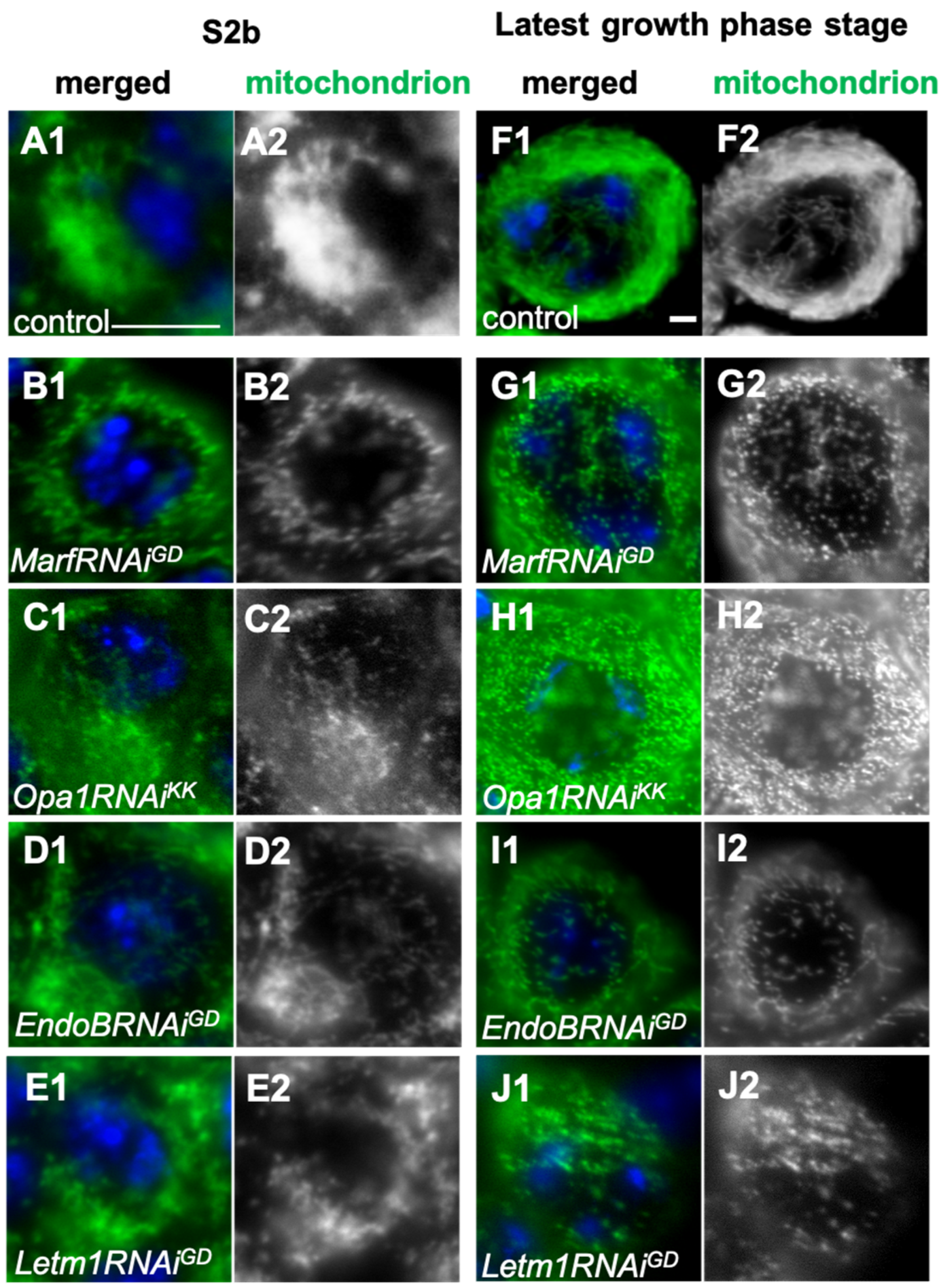 Figure 4. Knockdown of the mitochondrial fusion factor genes Marf and Opa1 and that of EndoB and Letm1 and their distribution in spermatocytes during the cell growth phase. (A1J1) Immunostaining of early spermatocytes at S2b (A1E1), and at S6 or the most developed stages of the growth phase (F1J1) conducted to visualize mitochondria (green in (A1J1) and white in (A2J2)). Blue in A1–J1: DNA. (A1,F1) Wild-type (control) spermatocytes at S2b (A1) and S6 (F1). Spermatocytes at S2b (A1E1) and S6 (F1J1) with knockdown of the mitochondrial fusion factors Marf and Opa1 and the morphology proteins EndoB and Letm1. (B1,G1) MarfRNAiGD, (C1,H1) Opa1RNAi Opa1RNAiKK. Spermatocytes at S2b (D1,E1) and S6 (I1,J1) with knockdown of EndoB and Letm1. (D1,I1) EndoBRNAiGD. (E1,J1) Letm1RNAiGD. Bars: 10 μm.