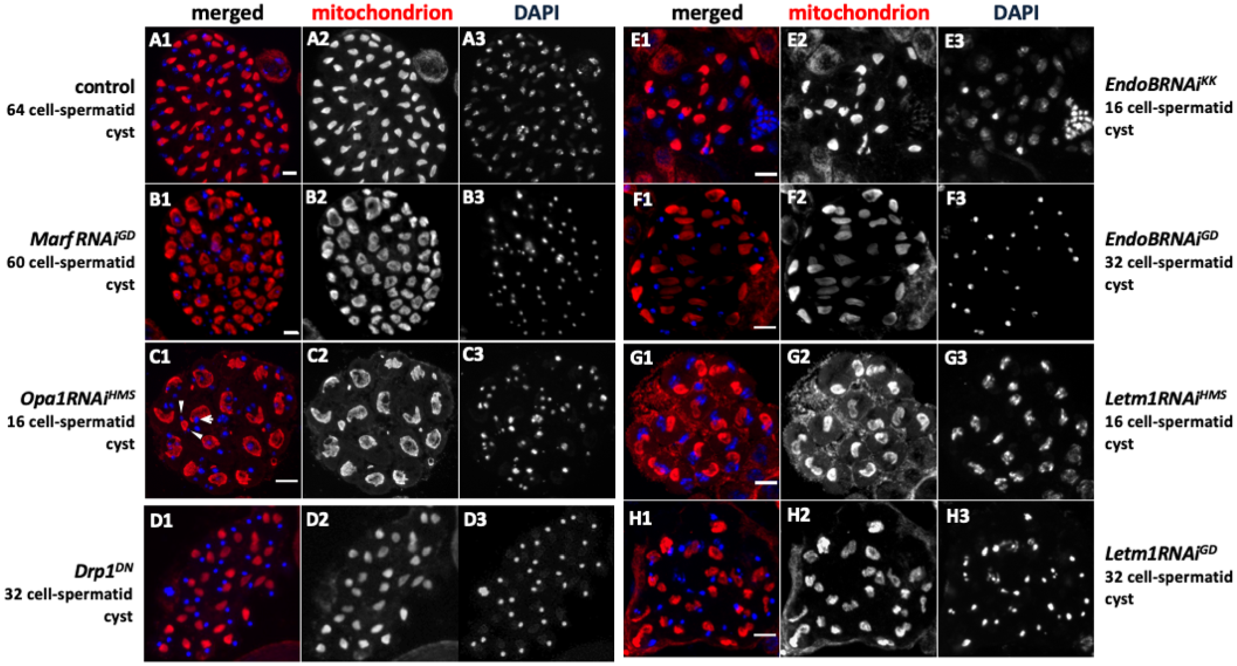 Figure 6. Abnormal spermatid cysts derived from the spermatocytes in which mitochondrial fusion and fission factors and EndoB and Letm1 were knocked down without undergoing either one of or both meiotic divisions. (A1H1) Immunostaining was conducted to visualize mitochondria (red in (A1H1) and white in (A2H2)) in the spermatids of intact cysts at the onion stage. DNA staining (blue in (A1H1) and white in (A3H3)). (A1) An intact cyst composed of 64 spermatids in the control testes. (B1D1) Intact spermatid cysts derived from spermatocytes in which Marf (B1; MarfRNAiGD) and Opa1 (C1; Opa1RNAiGD, D1; Opa1RNAiHMS) were knocked down. (B1) An intact spermatid cyst composed of 60 cells in MarfRNAiGD testes. (C1) An intact cyst composed of only 16 cells in an Opa1RNAiHMS testis. The arrow in C1 indicates an example of normal-sized nuclei, and arrowheads indicate smaller nuclei. (D1) An intact cyst composed of only 32 cells in the testes expressing a dominant-negative mutant Drp1DN. (E1H1) Intact spermatid cysts derived from spermatocytes subjected to knockdown of EndoB (E1; EndoBRNAiKK, F1; EndoBRNAiGD) and Letm1 (G1; Letm1RNAiHMS, H1; Letm1RNAiGD). (E1) An intact cyst composed of only 16 cells in an EndoBRNAiHMS testis, (F1) an intact cyst composed of only 32 cells in an EndoBRNAiGD testis, (G1), an intact cyst composed of only 16 cells in a Letm1RNAiHMS testis, and (H1) an intact cyst composed of only 32 cells in a Letm1RNAiKK testis. Bars: 10 μm.
