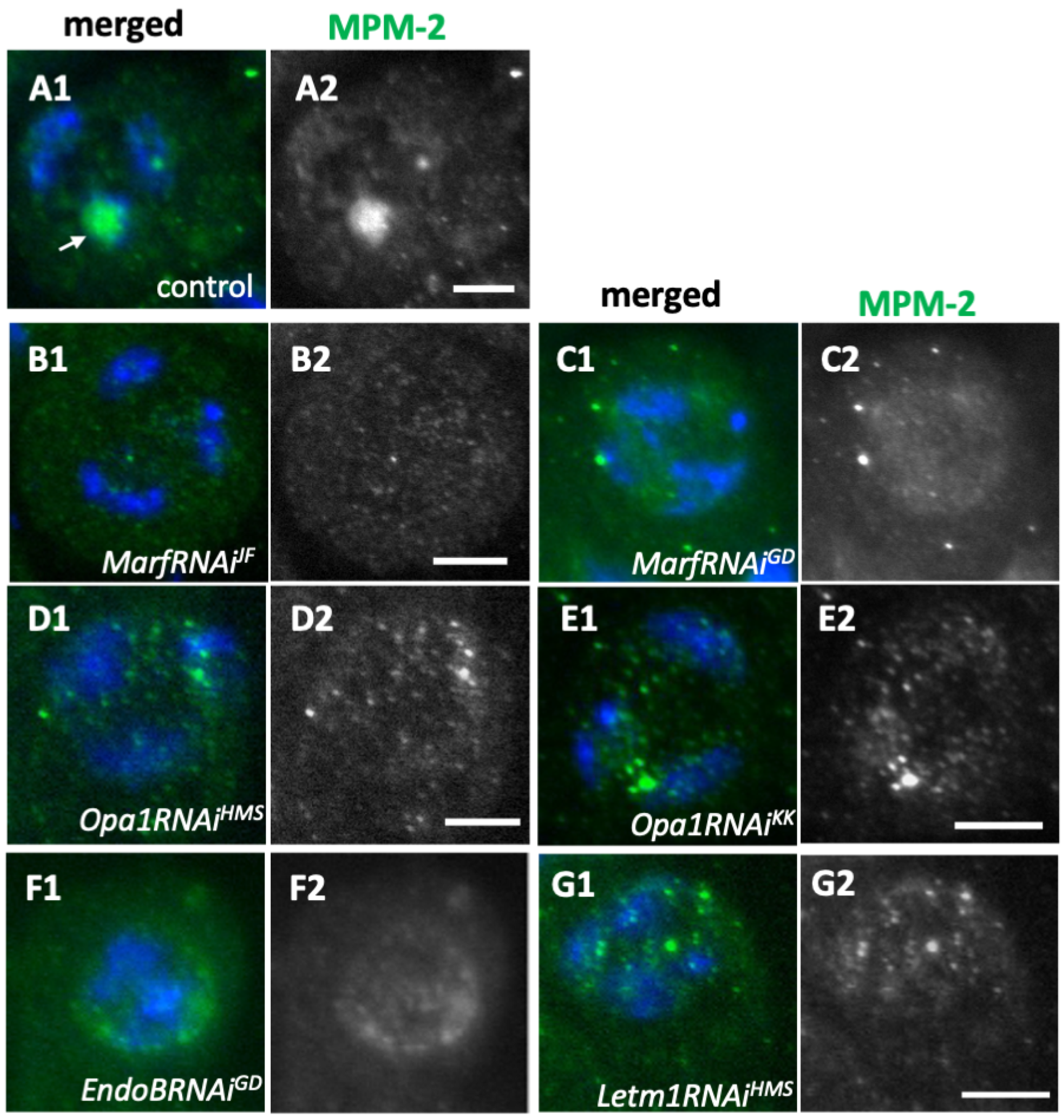 Figure 7. The absence of activated cyclin-dependent kinases in spermatocytes subjected to knockdown of mitochondrial fusion and fission factors. (A1G1) Immunostaining of spermatocytes with the MPM2 antibody that recognizes proteins phosphorylated by CDK1 (green in (A1G1) and white in (A2G2)). (A1) In wild-type spermatogonia before the onset of meiosis, a strong anti-MPM2 signal can be observed on the nucleolus (arrow). (B1G1) The spermatocytes subjected to knockdown of the mitochondrial fusion factors Marf (B1: MarfRNAiJF, C1: MarfRNAiGD) and Opa1 (D1: Opa1RNAiHMS, E1: Opa1RNAiKK). (F1,G1) The spermatogonia subjected to knockdown of EndoB (F1: EndoRNAiGD) and Letm1 (G1: Letm1RNAiHMS). Blue in (A1G1): DNA. Bars: 10 μm.
