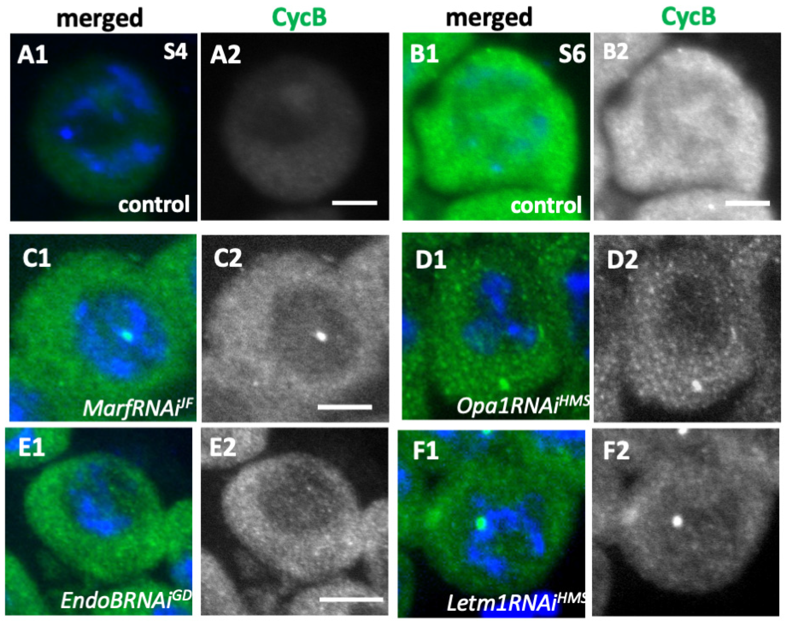 Figure 8. Loss of Cyclin B accumulation in the nuclei of spermatocytes with mitochondrial fusion factors and the morphology proteins knocked down. (A1F1)Anti-Cyclin B (CycB) immunostaining of primary spermatocytes (green in (A1F1) and white in (A2F2)). Blue in (A1F1): DNA. (A1,B1) The immunostaining signals in wild-type spermatocytes in the mid-cell growth phase (the S4 stage) (A1), and S6 (B1F1). (C1F1) The spermatocytes subjected to knockdown of Marf (C1: MarfRNAiJF,) and Opa1 (D1: Opa1RNAiHMS), and those with EndoB (E1: EndoBRNAiGD) and Letm1 (F1: Letm1RNAiHMS) knocked down at the most developed stages. Bars: 10 μm.