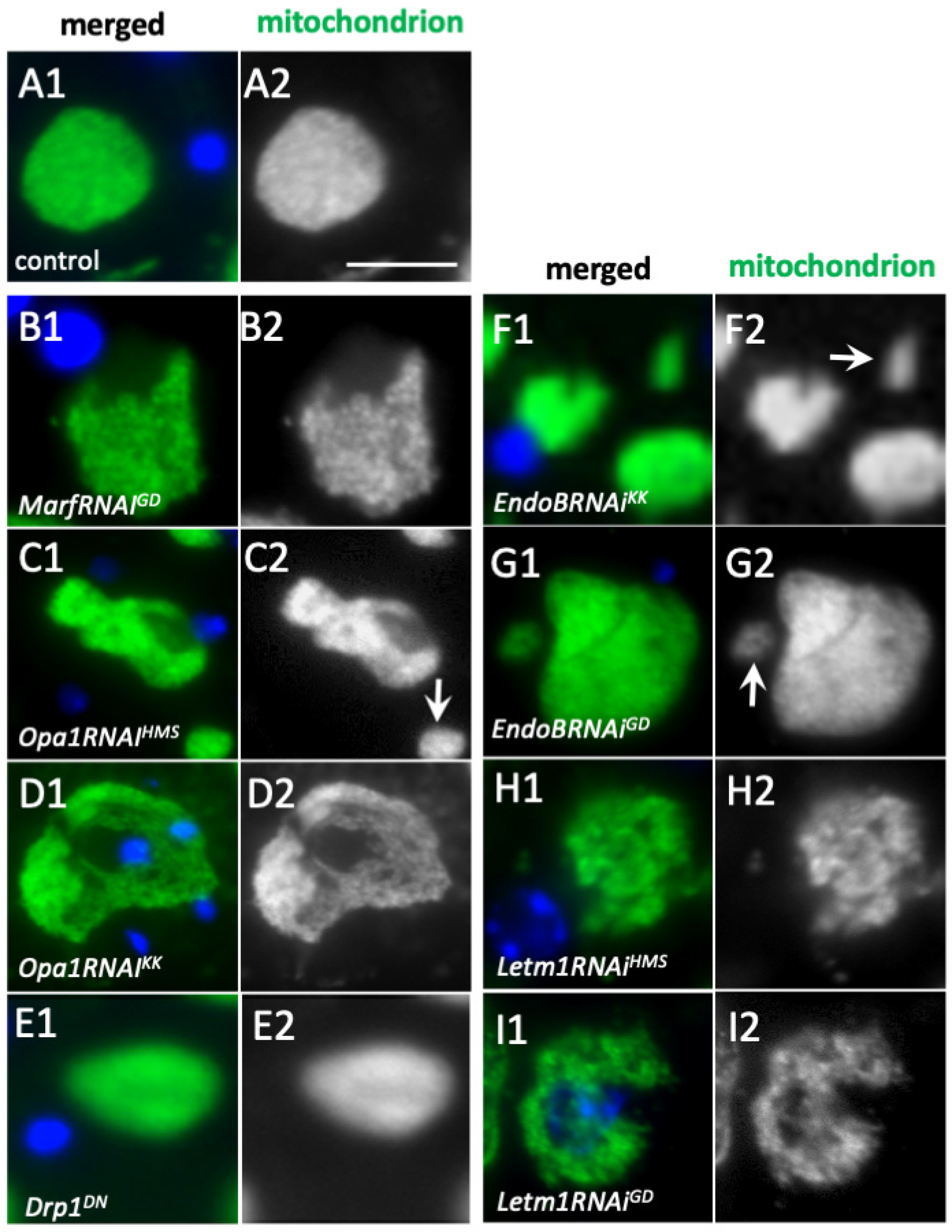 Figure 9. Abnormal formation of Nebenkerns in spermatids derived from spermatocytes subjected to knockdown of mitochondrial fusion factors and morphology proteins, and those from spermatocytes expressing Drp1DN. (A1I1) Immunostaining of spermatids at the onion stage conducted to visualize mitochondria (green in (A1I1) and white in (A2I2)). Blue in (A1I1): DNA staining. (A1) Control spermatid. (B1D1) Spermatids derived from spermatocytes with Marf (B1; MarfRNAiGD) and Opa1 (C1; Opa1RNAiHMS and D1; Opa1RNAiKK) knocked down. (E1) A spermatid from a spermatocyte expressing Drp1DN. (F1I1) Spermatids derived from spermatocytes subjected to knockdown of EndoB (F1; EndoRNAiJF and G1; EndoBRNAiGD) and Letm1 (H1: Letm1RNAiHMS and I1: Letm1RNAiGD). Arrows in (C2,F2,G2): These spermatids possess multiple small Nebenkerns. Bar: 10 µm.