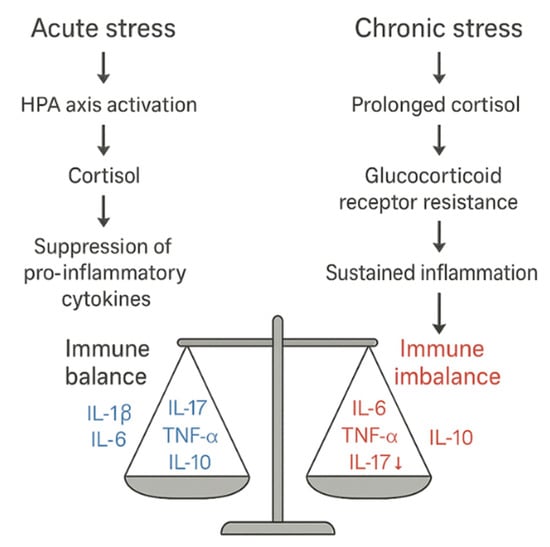 However, under conditions of chronic stress, the HPA axis may lose its adaptive function. Prolonged cortisol exposure can lead to feedback impairment and glucocorticoid receptor resistance, resulting in diminished immunosuppressive effects and a pro-inflammatory state [,]. Prolonged stress may disturb cytokine regulation, promote sustained inflammatory activity, and weaken the numbers and functional capacity of protective immune cells []. Such chronic HPA axis dysfunction not only impacts the way the immune system responds to stressors but also shifts the immune environment toward autoimmunity, thereby contributing to the onset or exacerbation of diseases such as rheumatoid arthritis, lupus, or multiple sclerosis [].