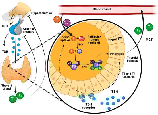 The synthesis and release of THs are initially stimulated by the production of thyrotropin-releasing hormone (TRH) in the hypothalamus, which stimulates the synthesis and secretion of thyroid-stimulating hormone (TSH) in the anterior pituitary [22,23]. Next, TSH binds to its receptor on the thyroid gland, stimulating the biosynthesis and secretion of THs [23]. This regulatory pathway is part of the neuroendocrine system known as the hypothalamic–pituitary–thyroid (HPT) axis [24]. Additionally, THs regulate the secretion of TRH and TSH through a negative feedback loop [22]; in particular, THs inhibit the transcription of TRH and TSH subunit genes, as well as the post-translational modification and release of TSH [23].