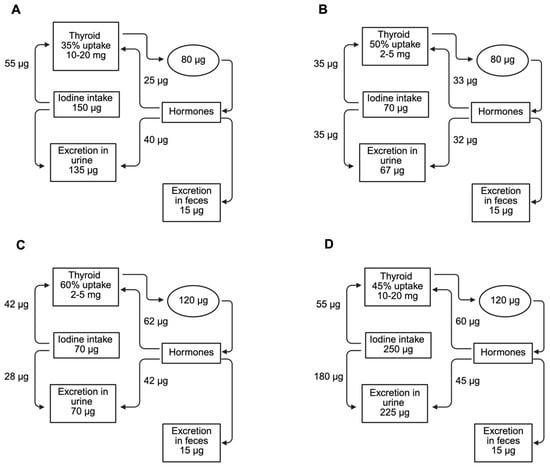 The increase in iodine requirements during pregnancy due to urinary losses [84,85] results in increased TH production, and the transfer of iodine to the fetus is compensated for by increased thyroid iodide uptake [86,87,88,89,90]. Therefore, although the recommended adequate iodine intake for adults is 150 μg/day, the WHO recommends an iodine intake of 250 μg/day for pregnant women (Figure 2D) [7]. Urinary iodine concentration (UIC) is a sensitive indicator of current iodine intake, as roughly 90% of all consumed iodine is excreted in the urine [91]. The median UIC indicative of optimal iodine intake in pregnant women ranges between 150 and 249 µg/L [92]. In pregnant women with adequate iodine levels, the increased iodide requirements due to renal losses and fetal iodide transfer often go unnoticed (Figure 2D); however, for those with borderline low iodine intake, pregnancy can exacerbate iodine deficiency, stressing the homeostatic mechanisms that maintain a euthyroid state [6]. A healthy, non-pregnant woman typically needs about 80 µg of iodide daily to produce THs. When iodide intake is optimal at 150 µg/day, a thyroid uptake of 35% is sufficient to maintain balance and support iodine stores, which range from 10 to 20 mg (Figure 2A). Of the 80 µg of iodide ingested, 15 µg is lost through the feces, while the remaining 65 µg is divided between the thyroid and renal losses [93]. When iodide intake is low, the thyroid compensates by increasing its iodide uptake to meet the daily requirement of 80 µg for production of THs. Despite this, a daily deficit of around 12 µg occurs, leading to a gradual depletion of thyroid iodine reserves (Figure 2B). In iodine-deficient pregnant women, the iodide requirement increases from 80 to 120 µg/day due to a 50% increase in TH production (Figure 2C). Although the thyroid increases iodide uptake, the abovementioned total iodide intake is insufficient to meet the heightened requirement for TH production and the daily iodide deficit rises to about 20 µg/d [6,94].
