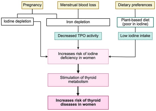 Determinants of the risk of iodine deficiency in women. Physiological (pregnancy, menstrual blood loss) and dietary (plant-based, low-iodine intake) factors promote iodine or iron depletion, reducing thyroperoxidase (TPO) activity and increasing the risk of thyroid dysfunction. Created in BioRender.com (accessed on 5 February 2025).