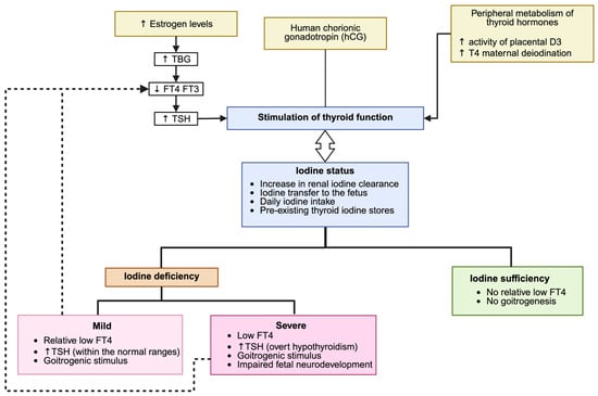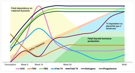 Pregnancy induces several physiological modifications of thyroid function, caused by increased TBG concentrations due to estrogen stimulation of hepatocyte protein synthesis by week 7 of gestation. Compared to pre-conception levels, TBG concentrations are 2.5 times higher than in non-pregnant women [101,102]. This increase in serum TBG leads to higher total T4 and T3 levels, associated with a slight decrease in free THs [95,103]. T4 synthesis increases during pregnancy to compensate for the increased hormone-binding capacity of TBG [15], helping to maintain optimal free hormone concentrations [104]. By the end of the third trimester, the peak hCG level causes a transient increase in free T4 and a transient decrease in TSH. Under normal conditions, TSH concentrations in the second half of pregnancy are similar to those in non-pregnant women. Conversely, TSH concentrations may increase above pre-conception reference ranges in women with low iodine intake (Figure 4) [2].