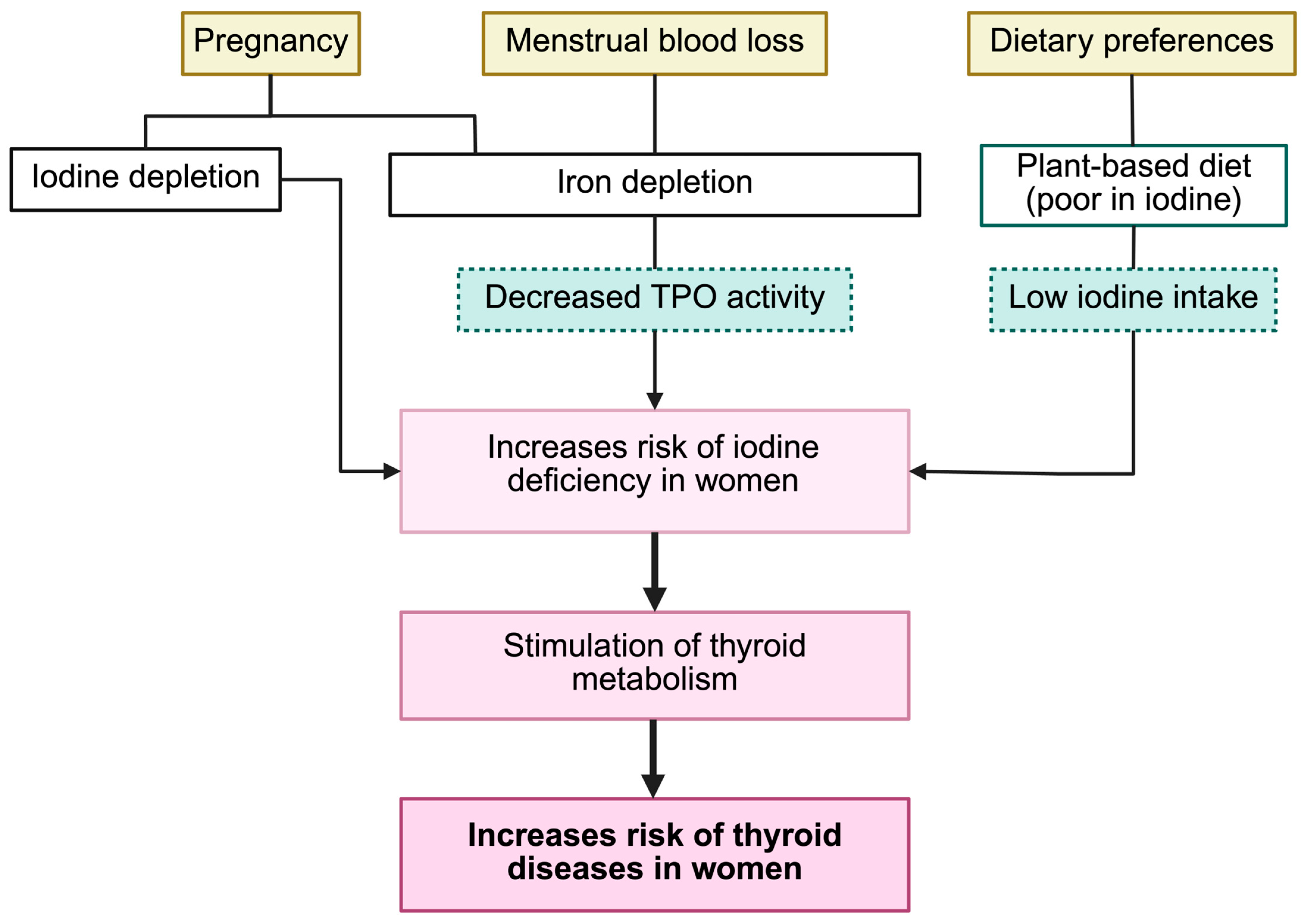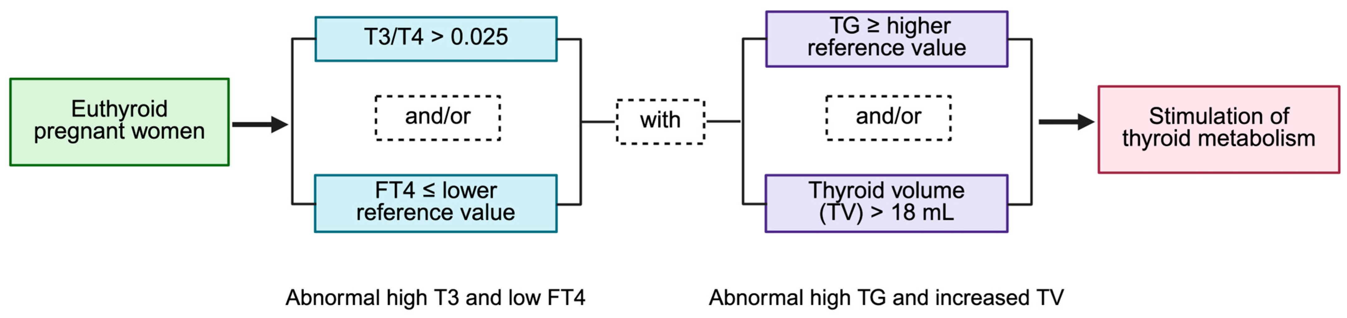 - Mégier, C.; Dumery, G.; Luton, D. Iodine and Thyroid Maternal and Fetal Metabolism during Pregnancy. Metabolites 2023, 13, 633. [Google Scholar] [CrossRef]