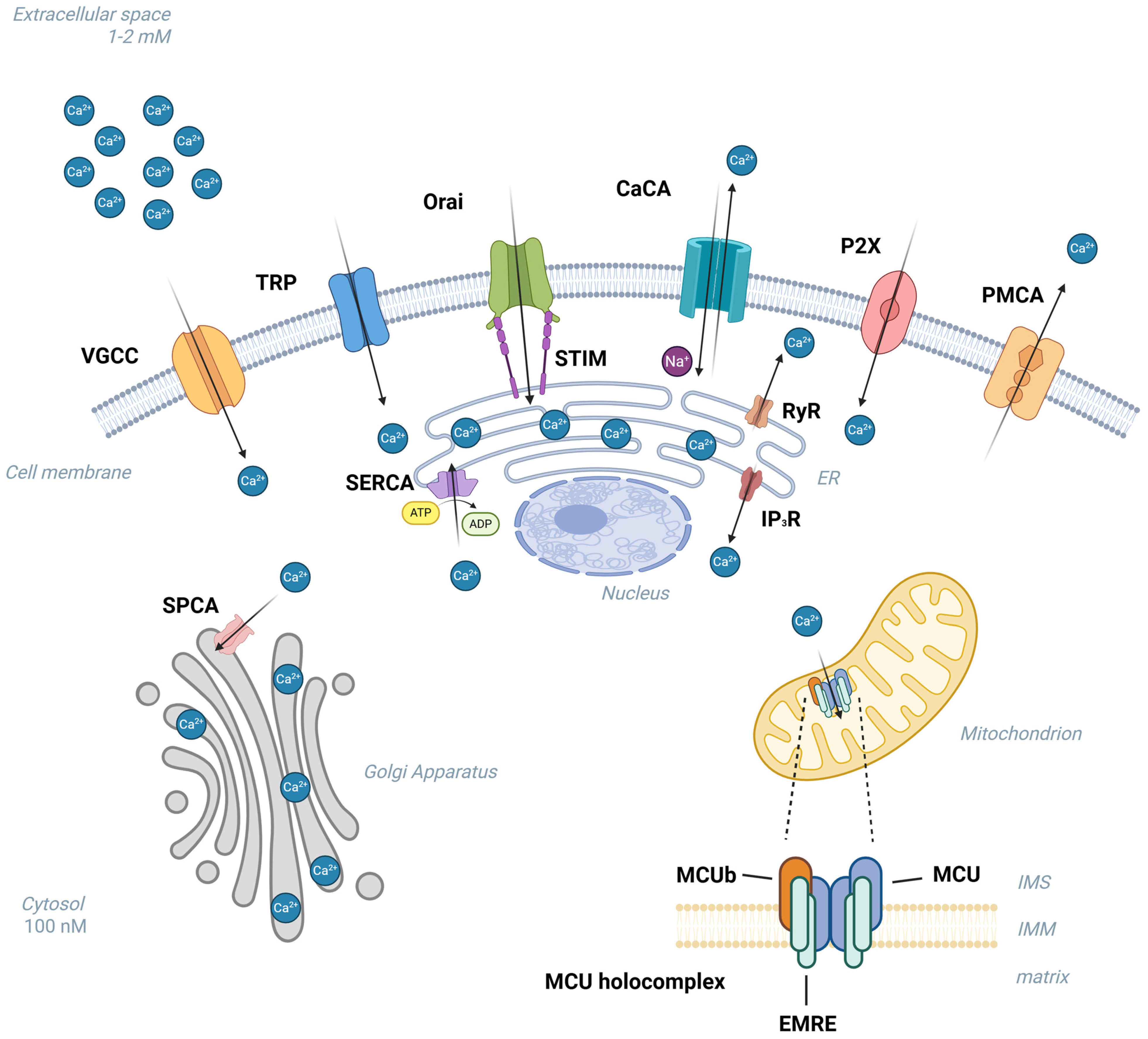 Figure 1. Calcium (Ca2+) homeostasis machinery in the human uterus. Different Ca2+ transporters, channels, exchangers, and pumps mediate cellular and compartments Ca2+ concentration. In the cell membrane, voltage-gated Ca2+ channels (VGCC), transient receptor potential channels (TRP), Orai, calcium channel antiporters (CaCA), purinergic P2X receptors, plasma membrane Ca2+-ATPases (PMCA) pump, and regulate the transport of Ca2+ ions through the cell membrane. Inositol 1,4,5-triphosphate receptors (IP3R), ryanodine receptors (RyR) and sarcoendoplasmic reticulum Ca2+-ATPase (SERCA) pump regulate the sequestration of Ca2+ in the endoplasmic reticulum. Mitochondrial Ca2+ uniporter (MCU) is crucial for controlling the mitochondrial Ca2+ uptake. ER—endoplasmic reticulum; EMRE—essential MCU regulator; MCUb—MCU dominant negative subunit beta; IMS—intermembrane space; IMM—inner mitochondrial membrane.