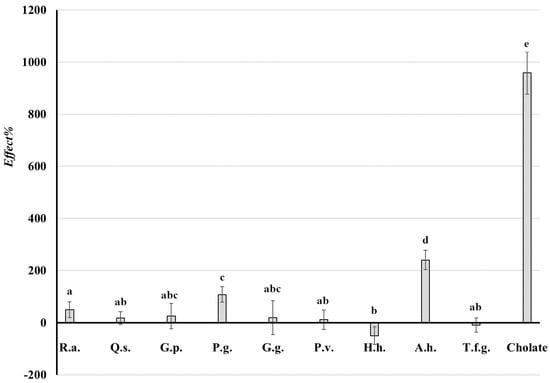 Effect% is the change in lipolysis concerning zero samples (without extract) and may become negative when lipase activity is inhibited or positive when enzyme activity is stimulated. R.a.—Ruscus aculeatus, Q.s.—Quillaja saponaria, G.p.—Gypsophila paniculata, P.g.—Panax ginseng, G.g.—Glycyrrhiza glabra, P.v.—Primula veris, H.h.—Hedera helix, A.h.—Aesculus hippocastanum, T.f.g.—Trigonella foenum graecum. There is no statistical significance of differences between bars marked with the same letter.