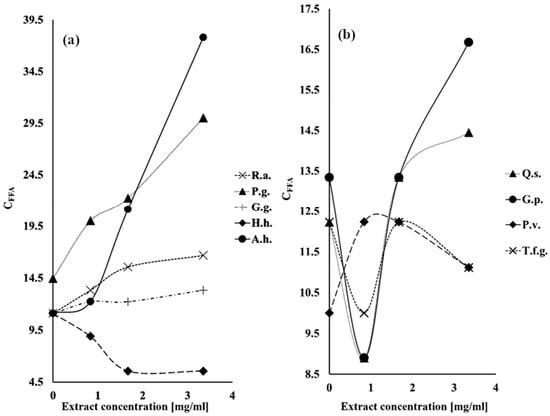 Effect of extracts obtained from selected saponin-rich raw materials on the lipolytic activity of pancreatin. The activity is expressed as CFFA (the number of μmoles of fatty acids released by lipase calculated per mg of pancreatin), (a) R.a.—Ruscus aculeatus, P.g.—Panax ginseng, G.g.—Glycyrrhiza glabra, H.h.—Hedera helix, A.h.—Aesculus hippocastanum, (b) Q.s.—Quillaja saponaria, G.p.—Gypsophila paniculata, P.v.—Primula veris, T.f.g.—Trigonella foenum graecum.